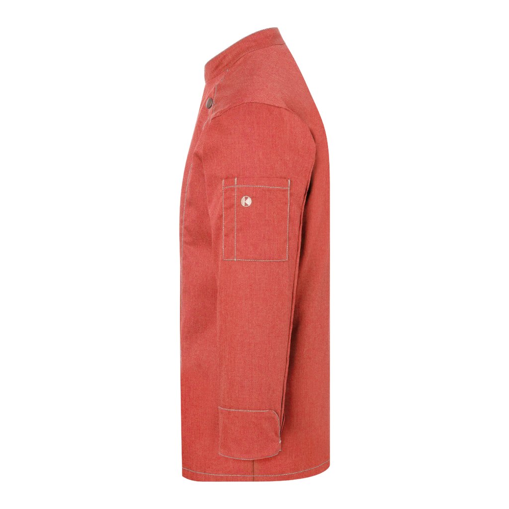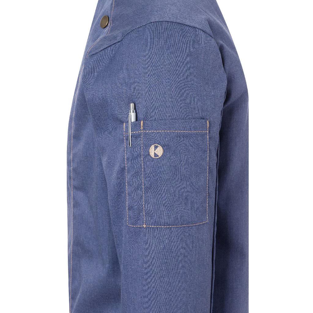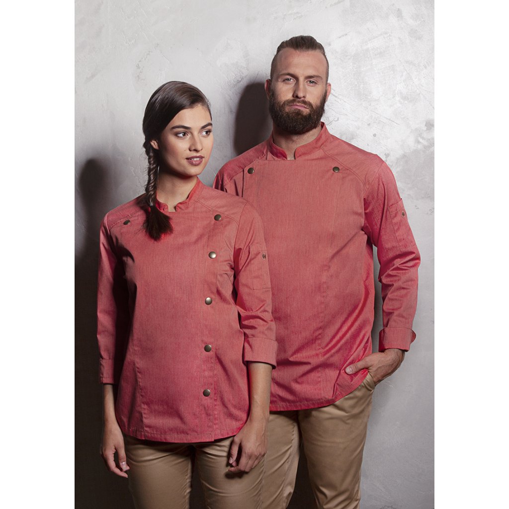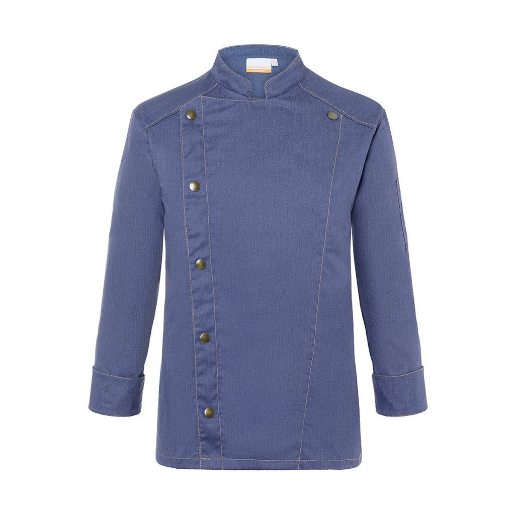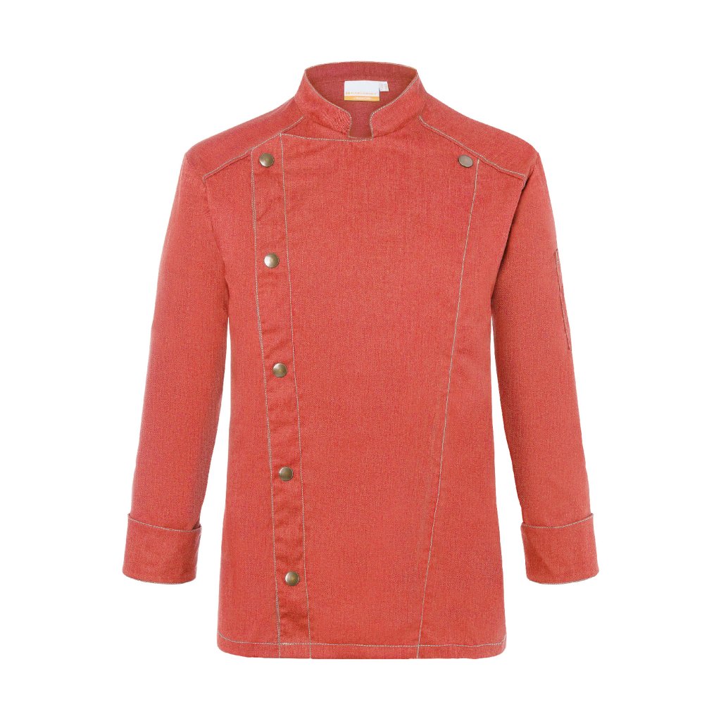 | keprová vazba, 65 % polyester / 35 % bavlna, 195 g/m² (vintage červená: 175 g/m²) | vysoce kvalitní, předsrážená, stálobarevná, snadná údržba | | trendy kuchařská bunda v džínovém stylu se štíhlým střihem | kontrastní barevné švy pro originální džínový vzhled | asymetricky zapínaná, jednoradová bunda s 5 knoflíky a druky pro rychlé zapínání a rozepínání | manžety rukávů se štěrbinou | našitá kapsa na rukávu (11 x 13 cm) na levé straně s praktickou přihrádkou na pera (2 x 13 cm) | vhodná pro průmyslové praní | odpovídající výrobek: dámská kuchařská bunda – JF 20 (číslo výrobku výrobce)Doplňkové parametry