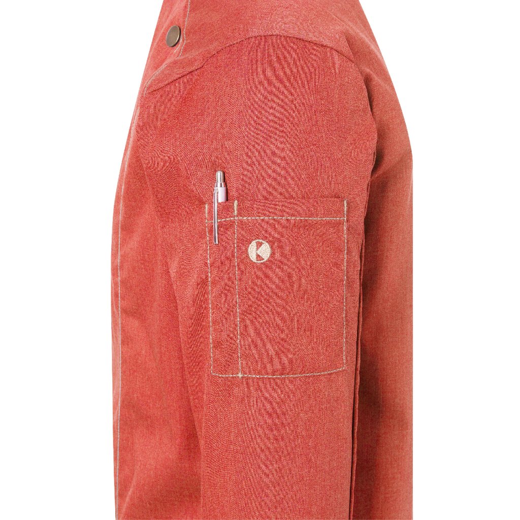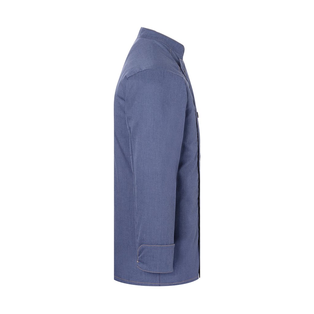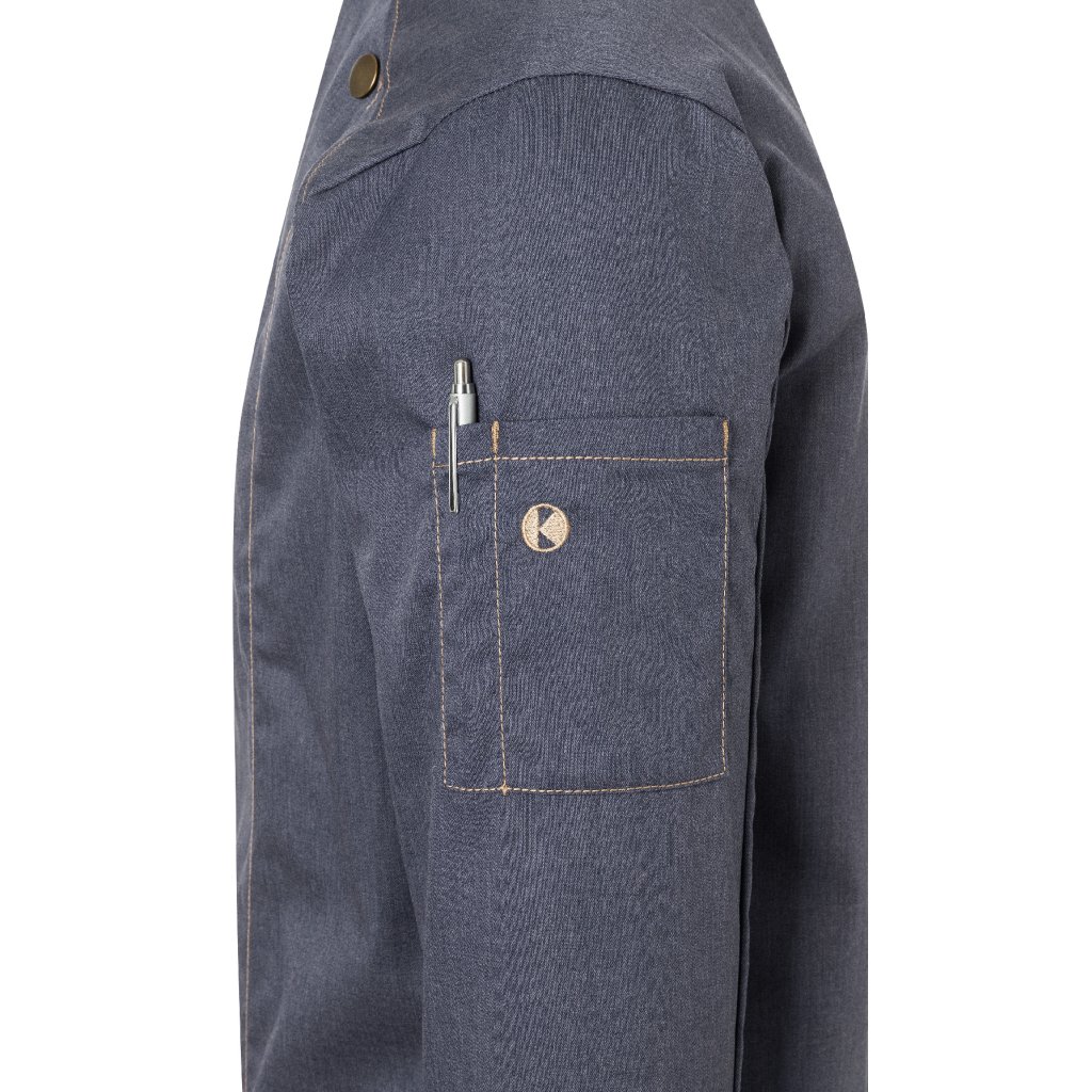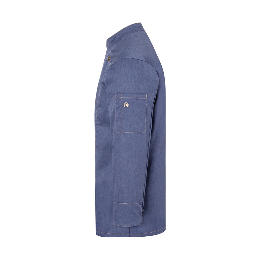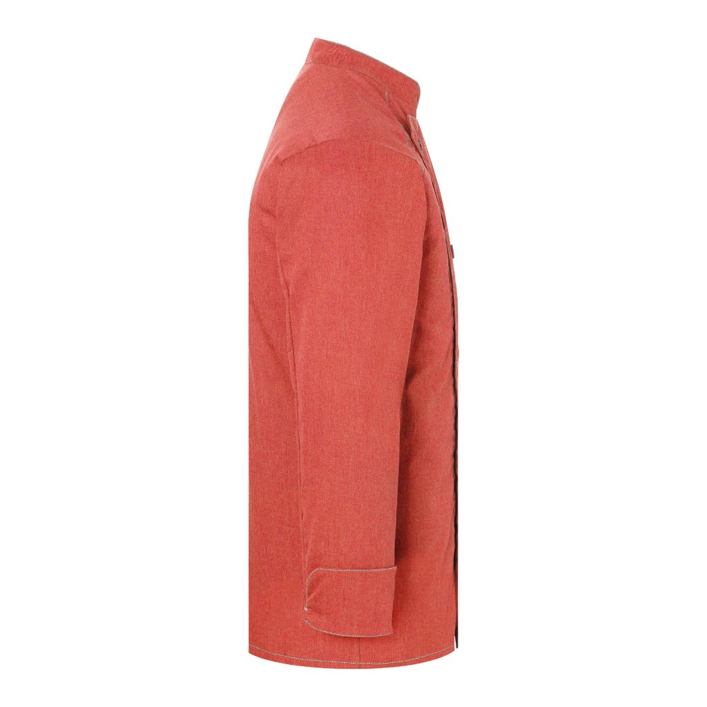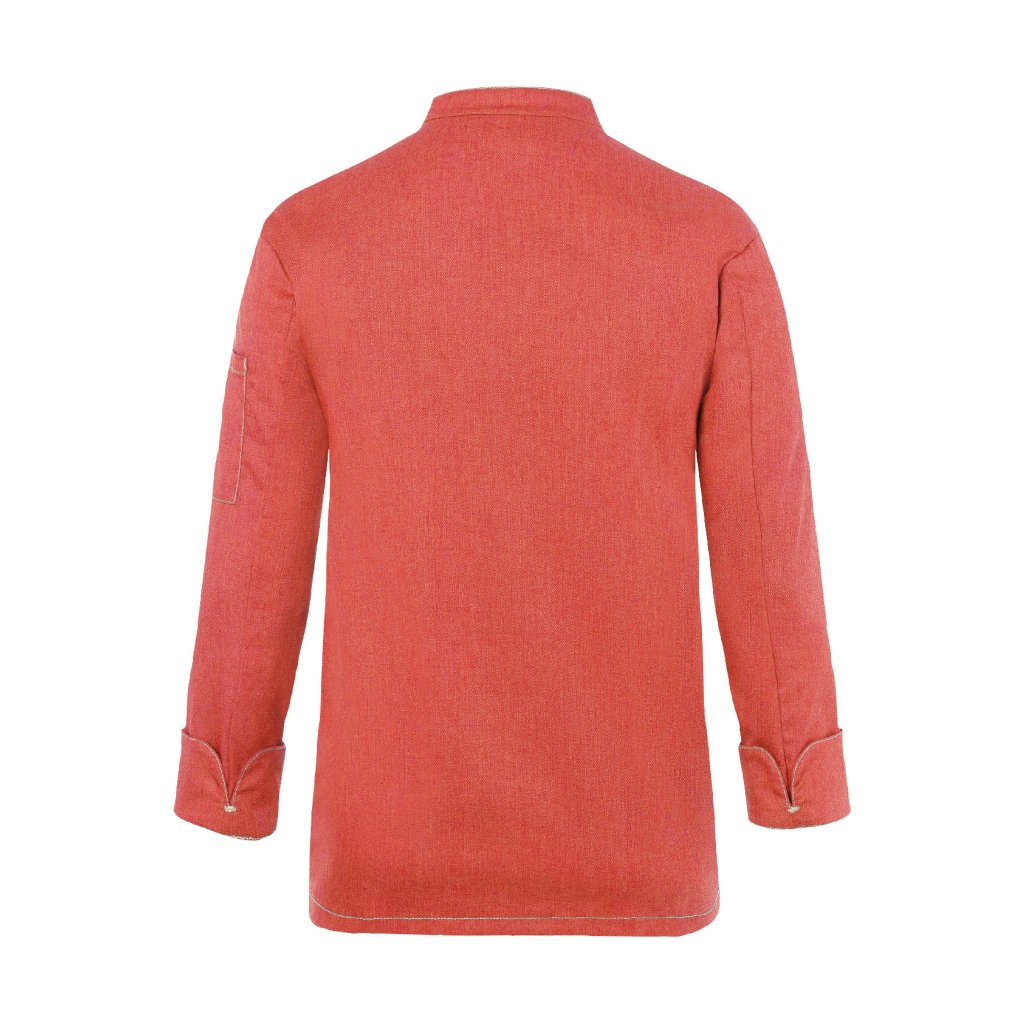 | keprová vazba, 65 % polyester / 35 % bavlna, 195 g/m² (vintage červená: 175 g/m²) | vysoce kvalitní, předsrážená, stálobarevná, snadná údržba | | trendy kuchařská bunda v džínovém stylu se štíhlým střihem | kontrastní barevné švy pro originální džínový vzhled | asymetricky zapínaná, jednoradová bunda s 5 knoflíky a druky pro rychlé zapínání a rozepínání | manžety rukávů se štěrbinou | našitá kapsa na rukávu (11 x 13 cm) na levé straně s praktickou přihrádkou na pera (2 x 13 cm) | vhodná pro průmyslové praní | odpovídající výrobek: dámská kuchařská bunda – JF 20 (číslo výrobku výrobce)Doplňkové parametry