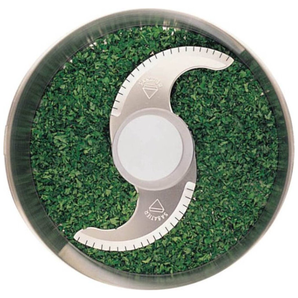 - nůž s jemným zubatým ostřím – pro nejjemnější zpracování –sekání zeleného koření a bylinek
