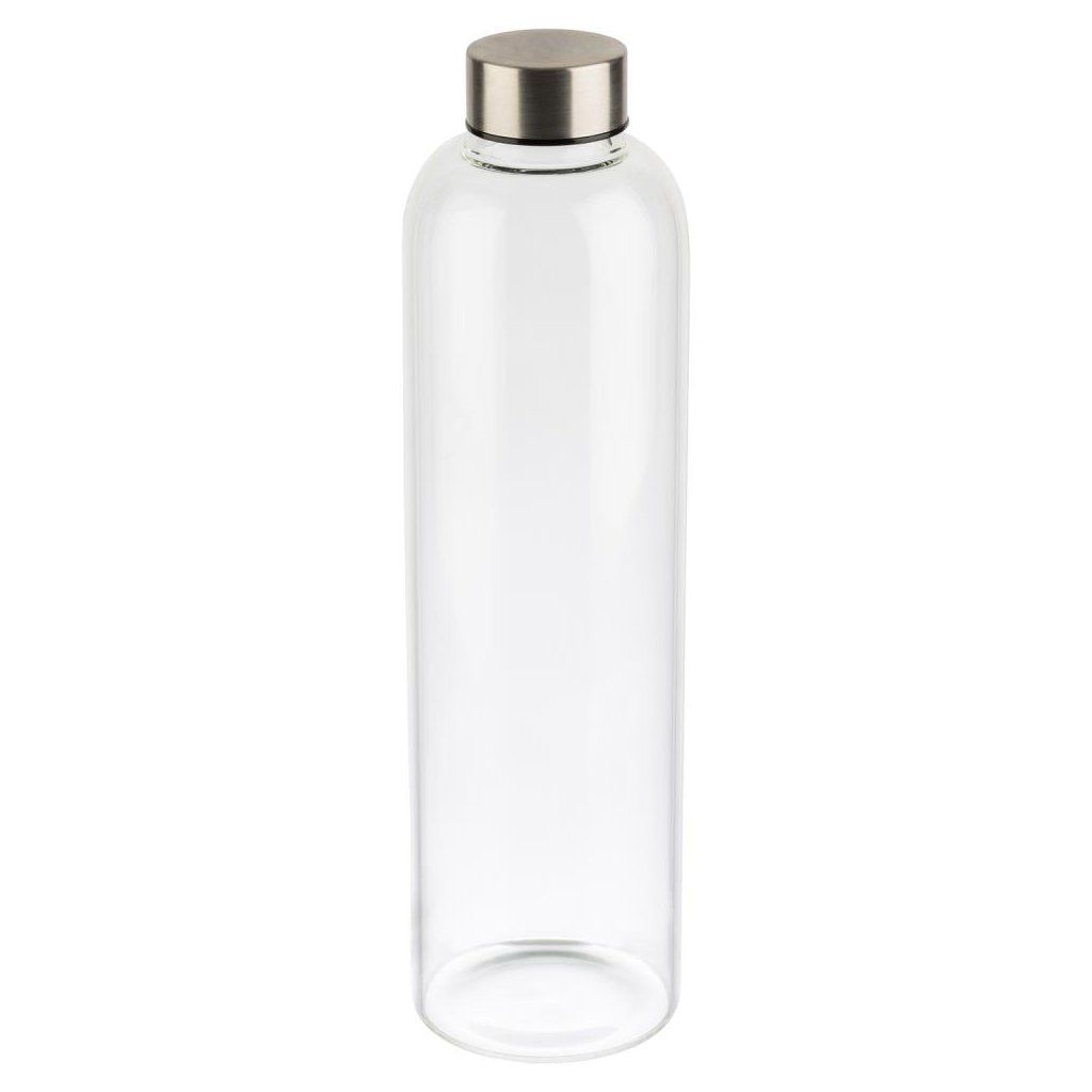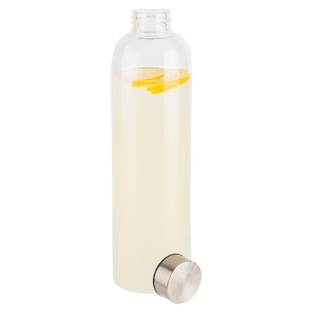 Transparentní láhev s elegantním uzávěrem z nerezové oceli.