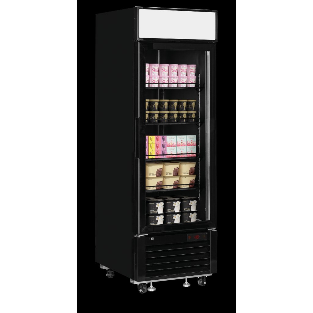 Elegantní černá mrazicí skříň s reklamním panelem Řada mrazicích skříní s prosklenými dveřmi LGF-B je navržena pro elegantní a efektivní vystavování v maloobchodních provozech. Dodává se s 1, 2 nebo 3 dveřmi. Je vybavena nastavitelnými policemi, vyhřívanými prosklenými dveřmi a dvěma LED světly na každé dveře pro optimální prezentaci výrobků. Dodává se s LED reklaním panelem a je ideální pro branding, který přitáhne pozornost. Díky energeticky úspornému chladicímu systému oceníte nízké provozní náklady a vaše výrobky budou vždy při ideální teplotě. K dispozici také v chladicí verzi (LGC).Doplňkové parametry