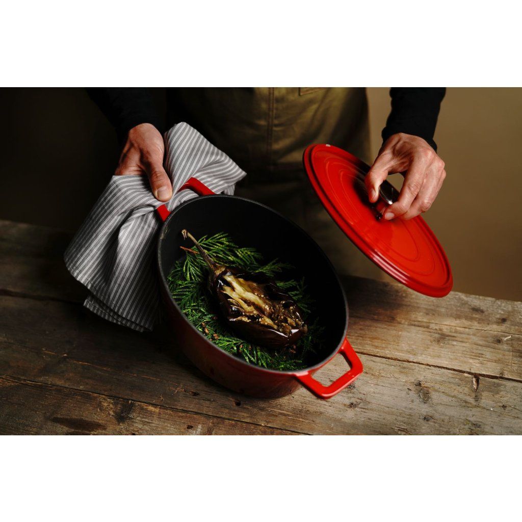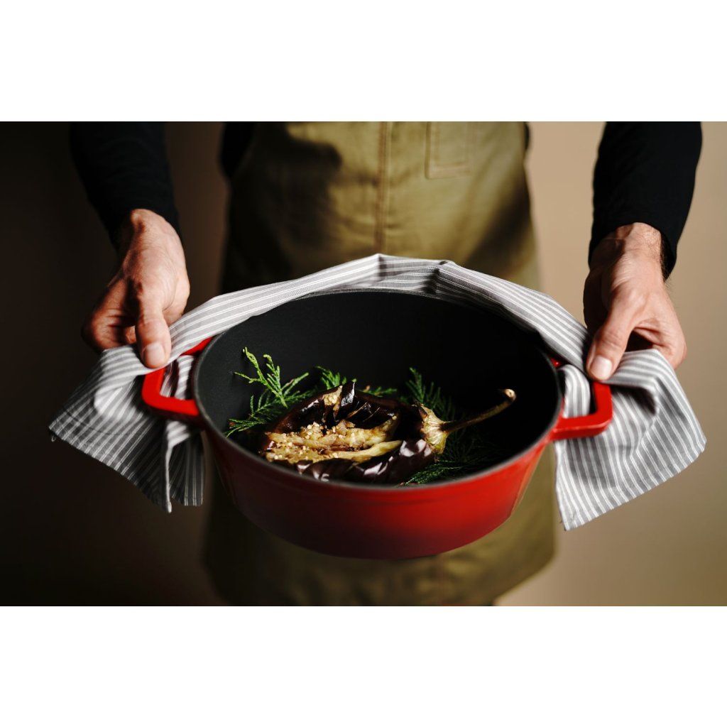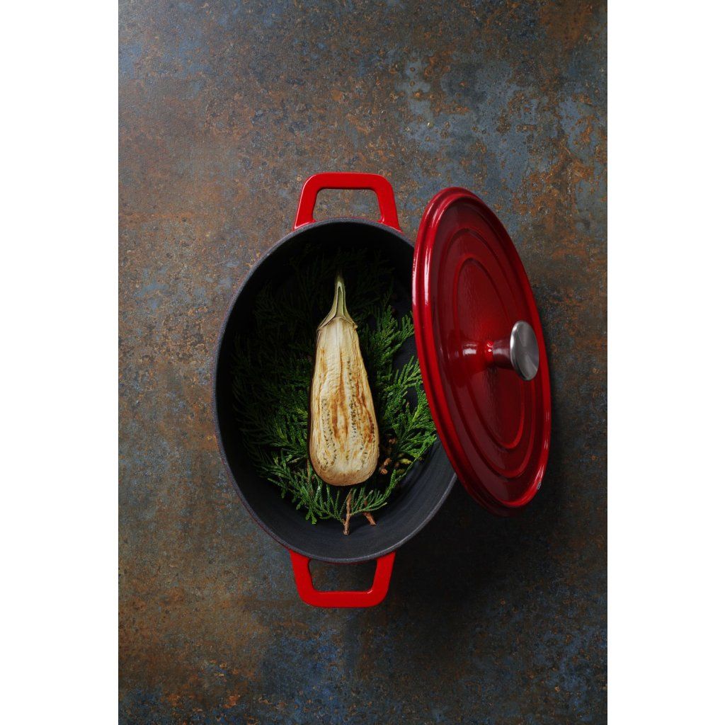 Vyrobeno výhradně z litiny se smaltovaným povrchem.Lid with bumps on the inside that force water droplets (steam) to fall back, keeping the dish moist and aromatic.Vhodné pro všechny zdroje tepla včetně indukce.Nelze mýt v myčce nádobí.K dispozici jsou různé velikosti; nejmenší lze použít jako servírovací misku (kód: 626856).Doplňkové parametry