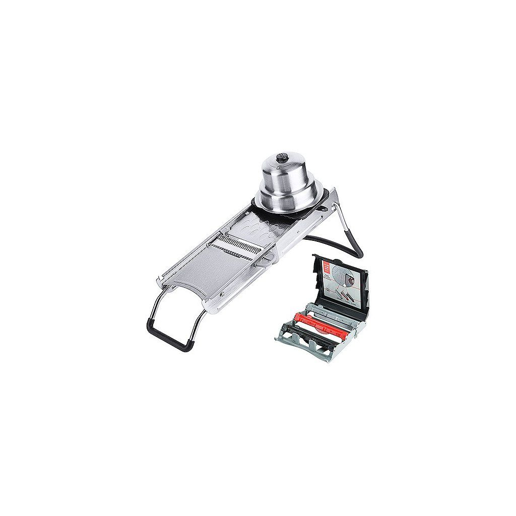 Mandolína z nerezové oceli s protiskluzovými prvky. Dva nože (hladký a vroubkovaný) a 4 výměnné nože 2 mm, 4 mm, 7 mm a 10 mm. Ergonimocký ruční přitlačný kolík.Doplňkové parametry