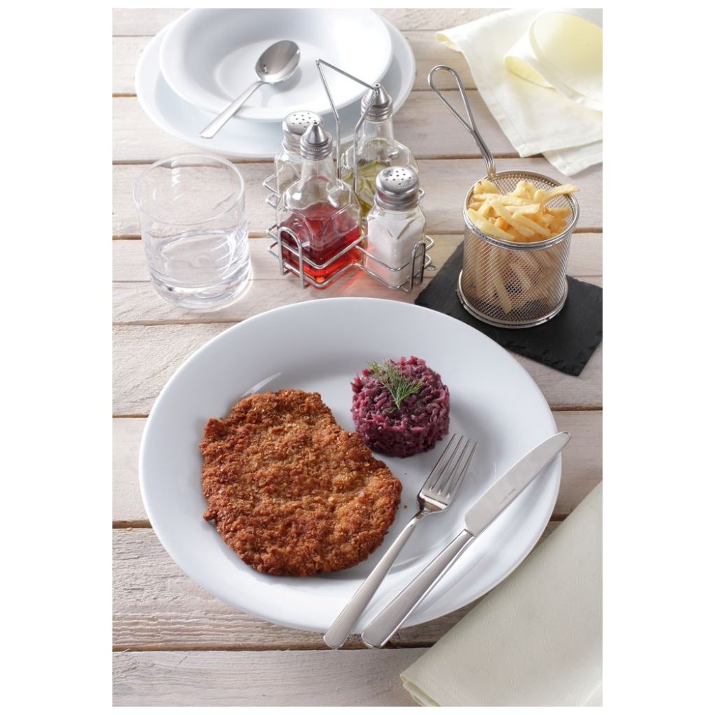Vysoce kvalitní, bílý hotelový porcelán. Zpevněné okraje, vysoká kvalita povrchu. Nejvyšší odolnost proti poškrábání, ubití okrajů a termický šokům. Prodává se pouze v balení. Vhodný do myčky a mikrovlnné trouby.Buďte první, kdo napíše příspěvek k této položce.