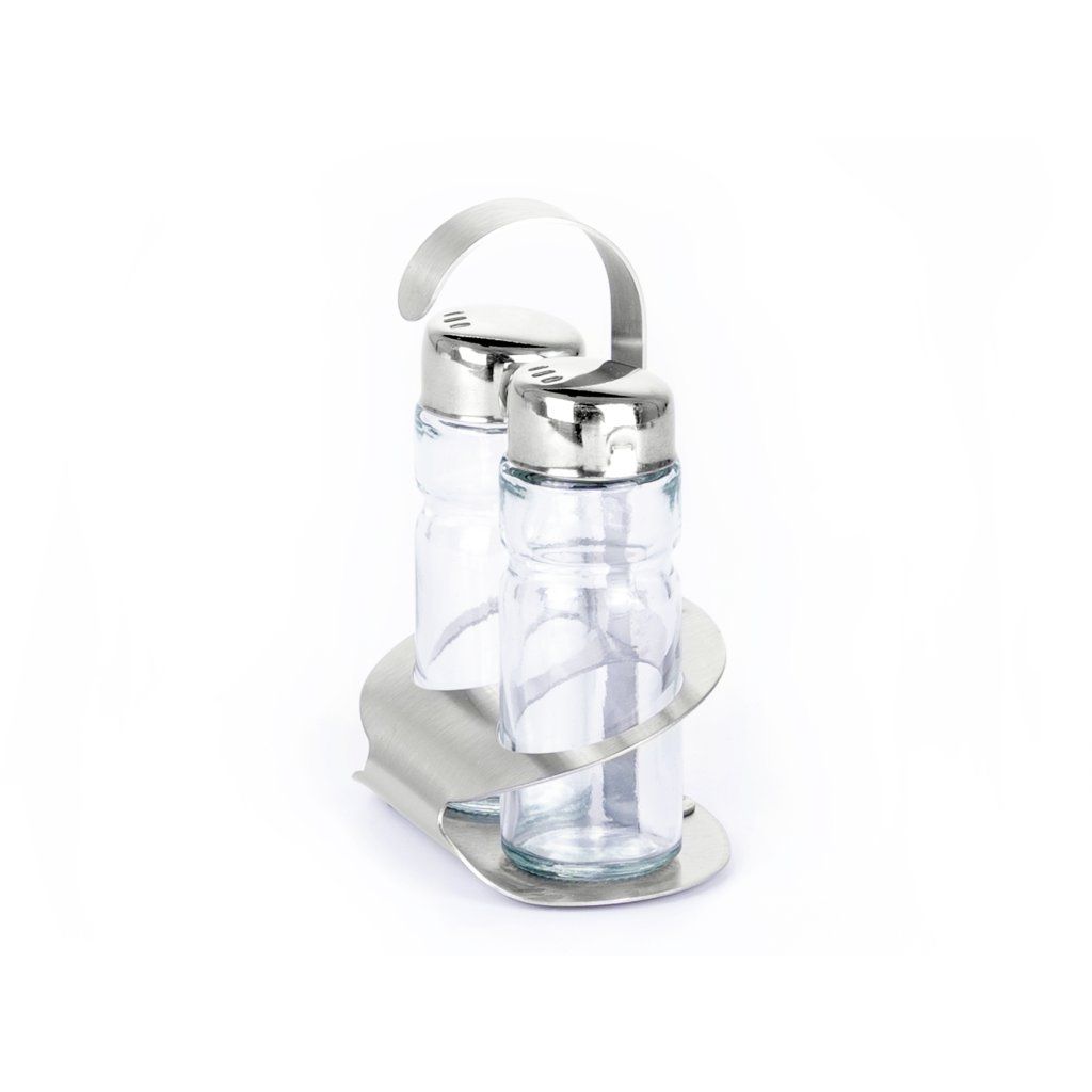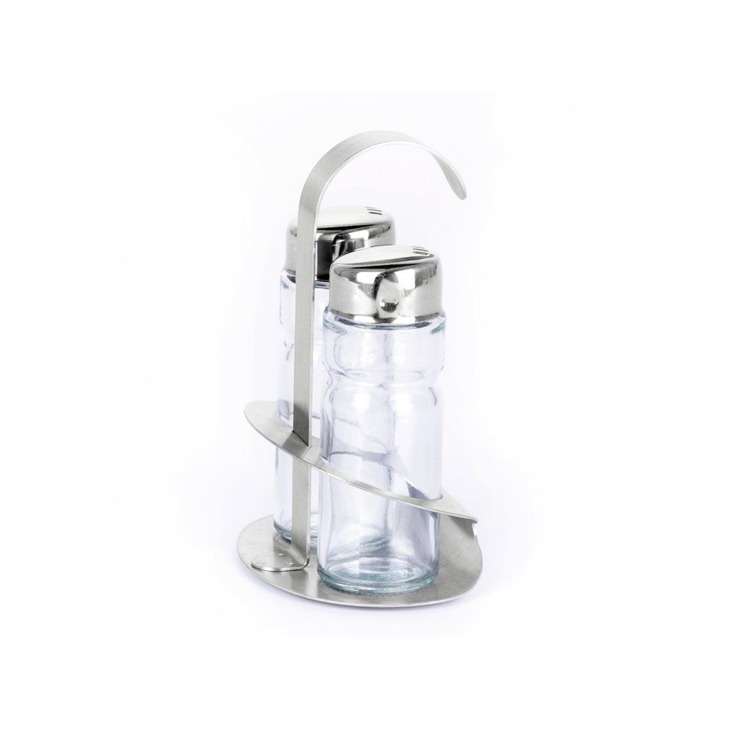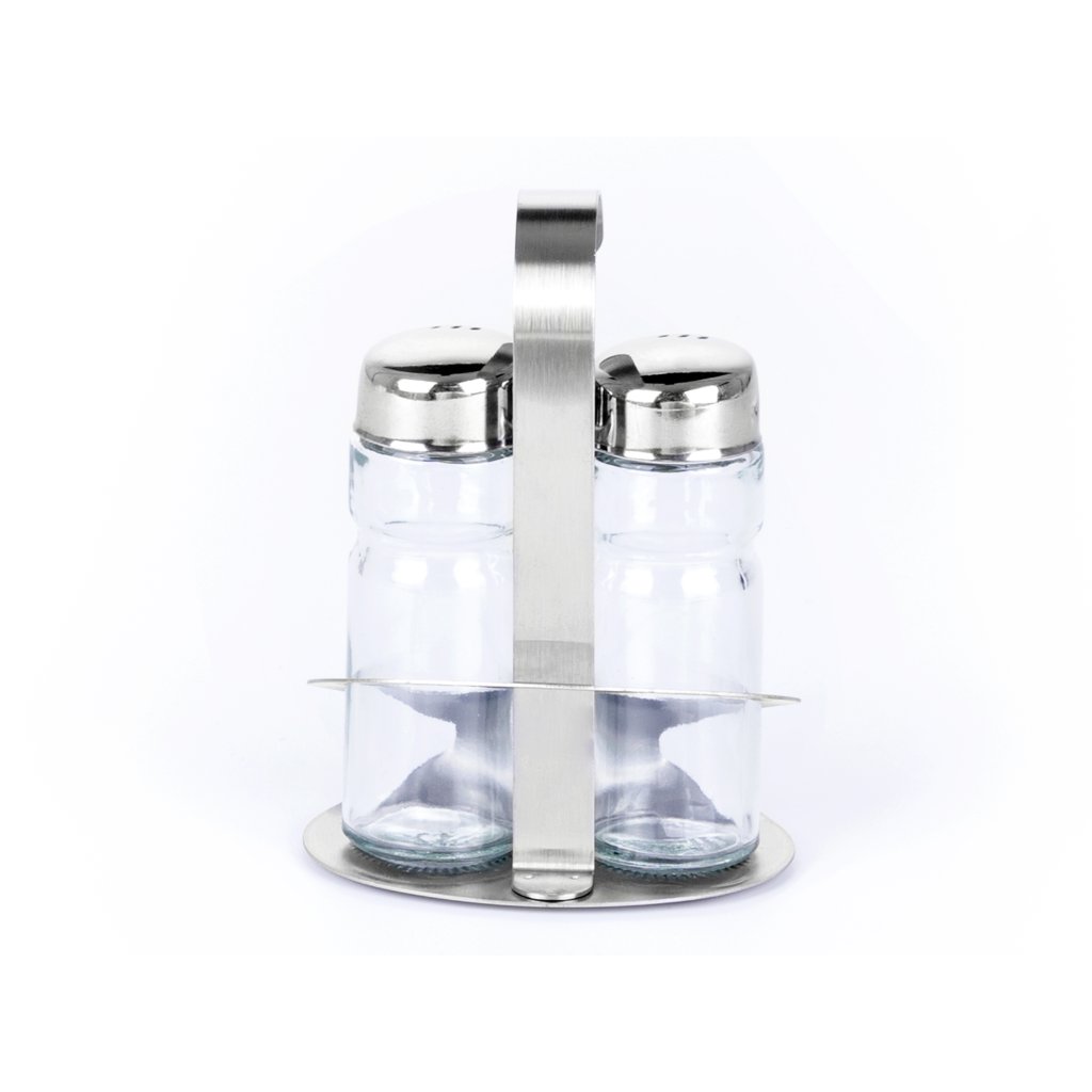 Dvoudílná menážka obsahuje:- nádoba na sůl- nádoba na pepřVíka jsou vyrobena z nerezové oceli 18/8.Podstava z nerezové oceli 18/0, opatřená rukojetí vhodnou pro přenášení.Doplňkové parametry