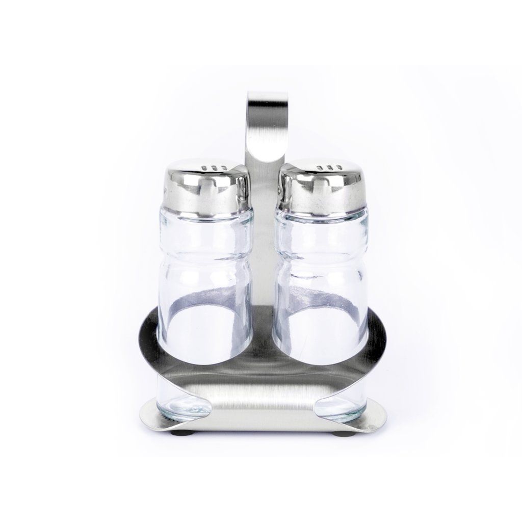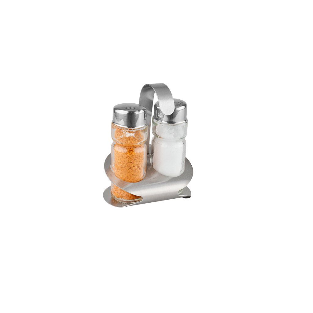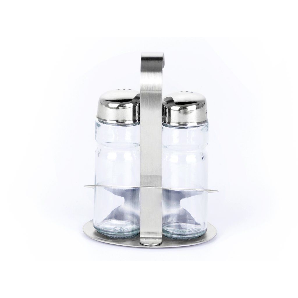 Dvoudílná menážka obsahuje:- nádoba na sůl- nádoba na pepřVíka jsou vyrobena z nerezové oceli 18/8.Podstava z nerezové oceli 18/0, opatřená rukojetí vhodnou pro přenášení.Doplňkové parametry