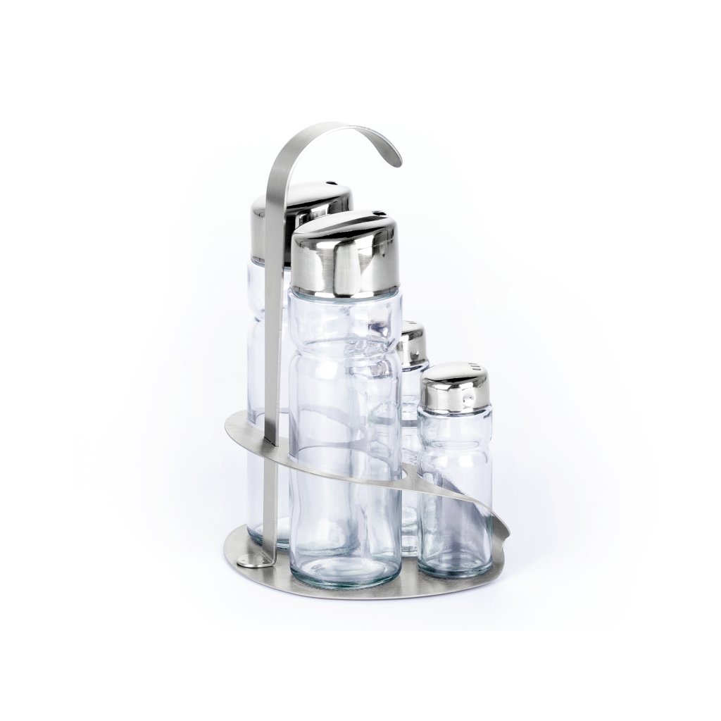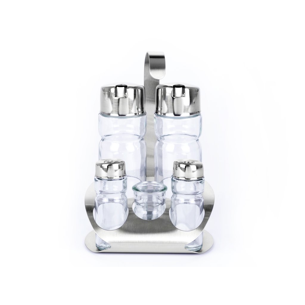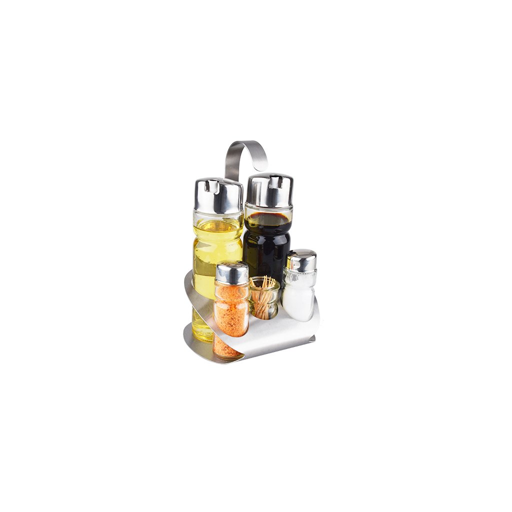 Pětidílná menážka obsahuje:- nádoba na sůl- nádoba na pepř- nádoba na olej- Nádoba na ocet- nádoba na párátkaVíka jsou vyrobena z nerezové oceli 18/8.Podstava z nerezové oceli 18/0, opatřená rukojetí vhodnou k přenášení.Doplňkové parametry