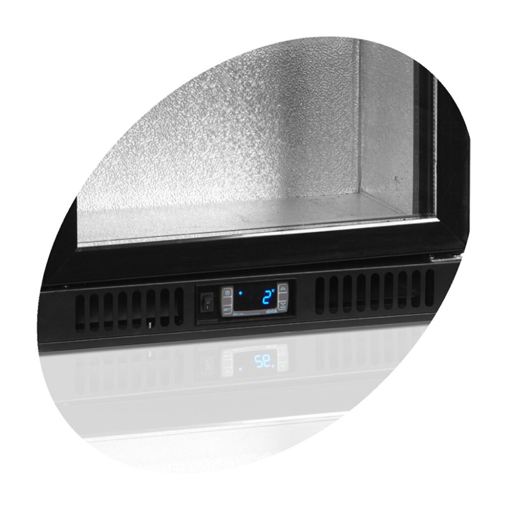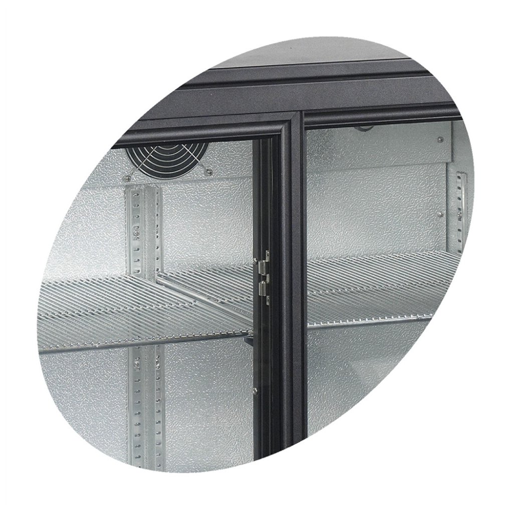 dvojité tvrzené sklo, samozavírací posuvné prosklené dveře, snadno přístupný elektronický termostat, nastavitelné police, nastavitelné nožky, vnitřní LED osvětlení, ventilované chlazeníDoplňkové parametry