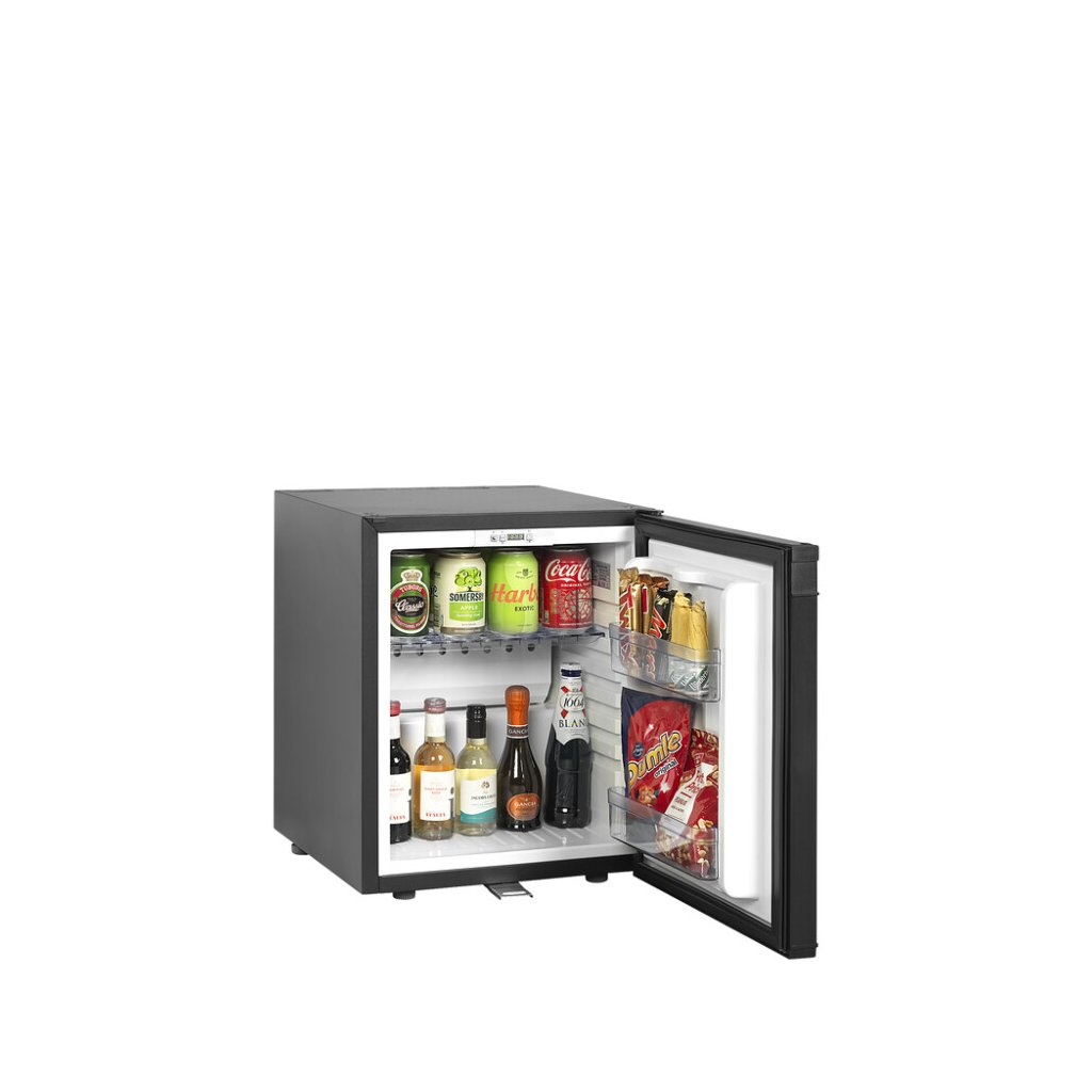 Minibar s mimořádně nízkou spotřebou energieTento kompresorový minibar s plnými dveřmi je vynikající volbou pro hotely v teplejším prostředí. Chladicí systém pomáhá zajistit nižší teplotu a kratší dobu pro dosažení požadované teploty ve srovnání s absorpčními minibary. Má také několik skvělých programovacích funkcí. Lze jej nastavit tak, že kompresor běží pouze v době, kdy je pravděpodobné, že bude místnost prázdná, např. od 9 do 12 hodin a od 18 do 21 hodin. To znamená, že v jiných časech, kdy je pravděpodobné, že se v místnosti zdržují hosté, je v ní naprosté ticho. Takzvaný water-pack udržuje v minibaru nízkou teplotu, i když není v provozu. Kromě toho také nabízí režim SLEEP pro zajištění ticha a funkcí FAST-cool pro okamžité chlazení. To je velmi praktické, pokud hosté přijedou v neobvyklou dobu.Minibar má černý vnější povrch a je navržen tak, aby byl elegantně nenápadný. Lze jej také plně integrovat pomocí vestavěného držáku a sady pro upevnění pantů, které umožňují společné otevírání dveří skříňky a minibaru. Stabilitu minibaru zajišťuje také sada pro upevnění pantů, která zabraňuje jeho převrácení a posunutí dopředu.Doplňkové parametry