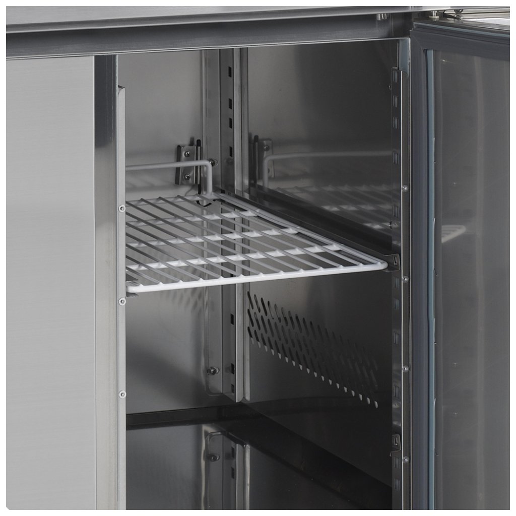 Mrazicí stůl bez desky (náhrada za NORDline GN BT univerzal bez desky)Tyto mrazicí nerezové stoly se dodávají standardně bez desky, která lze dokoupit na objednávku s lemem nebo bez lemu. Agregát je rovněž možné zvolit na pravé nebo levé straně. Stůl má samozavírací dveře. Tyto stoly jsou k dispozici také v chladicí verzi.NA OBJEDNÁVKU• pracovní deska bez lemu - výška 40 mm• pracovní deska s lemem - výška 40 mm, zadní lem 40 mm• nerezový držák roštu (pár)• roštDoplňkové parametry
