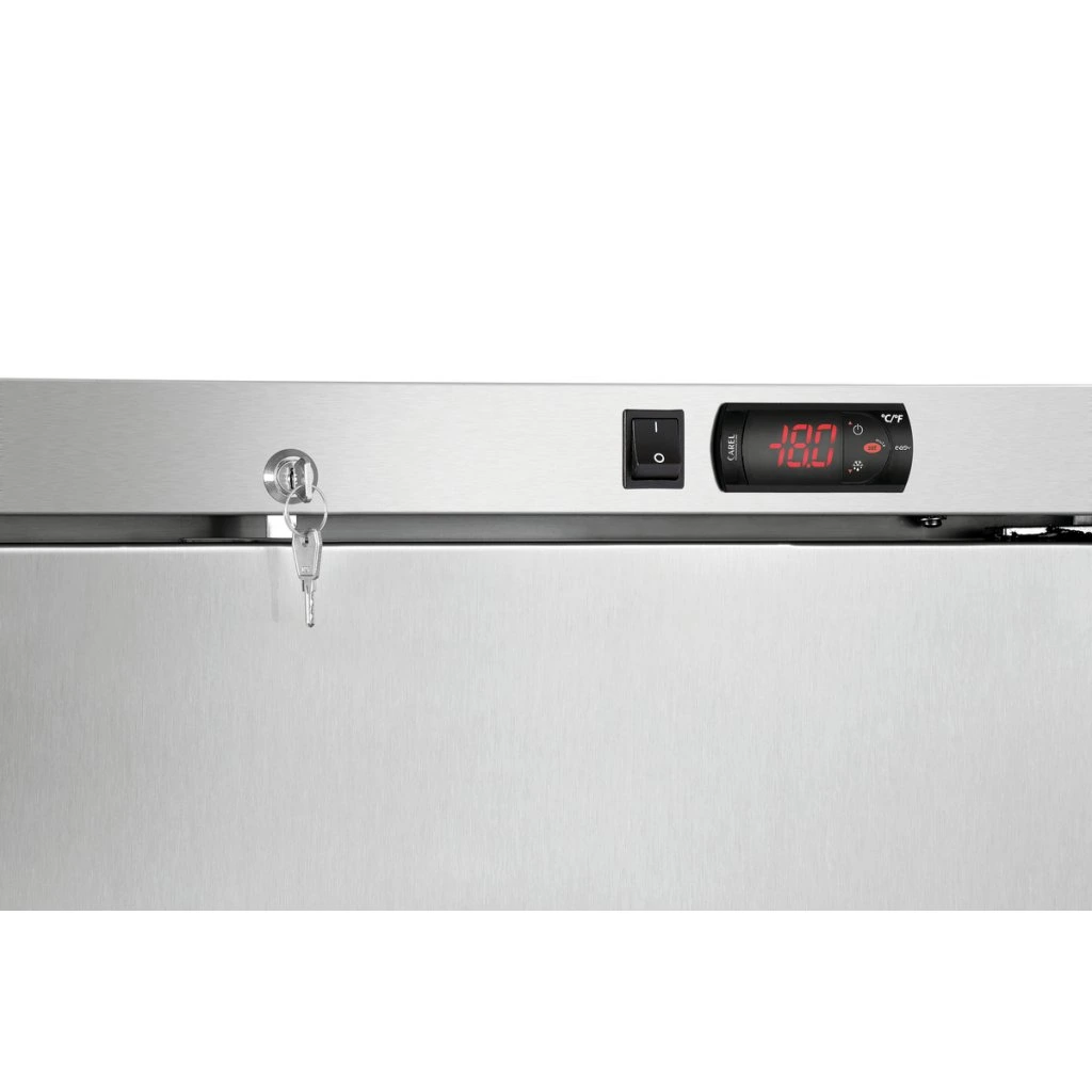 Uzamykatelná mraznička v odolném nerezovém provedení se snadno začlení do každé velké profesionální kuchyně. Požadovanou teplotu lze jednoduše a přesně nastavovat po 0,1 °C pomocí displeje. Vnitřní prostor lze efektivně využít díky šesti policím.