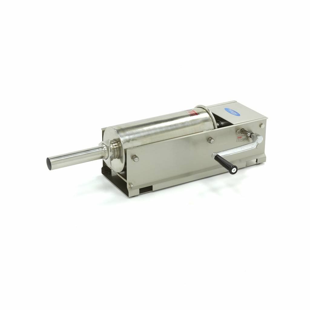 Pokud chcete vyrábět klobásy rychle a efektivně, použijte profesionální výrobník klobás. Díky své horizontální poloze se tento výrobník klobás hodí na jakoukoli pracovní desku. Díky plnicí kapacitě 5 litrů můžete rychle vyrobit velké množství klobás. Plášť, ve kterém se klobásy vyrábějí, lze snadno nasunout na jednu ze čtyř dodávaných plnicích trubek. Rozměry plnicích trubek jsou: 16, 22, 32 a 38 mm. Protože je přítlačná deska opatřena otvorem pro odvzdušnění, dostává se do párků co nejméně vzduchu. Kromě toho je uzavřena těsněním. Na boční straně je klička, kterou lze ovládat ručně, aby bylo možné vyrábět klobásy ve dvou rychlostech.