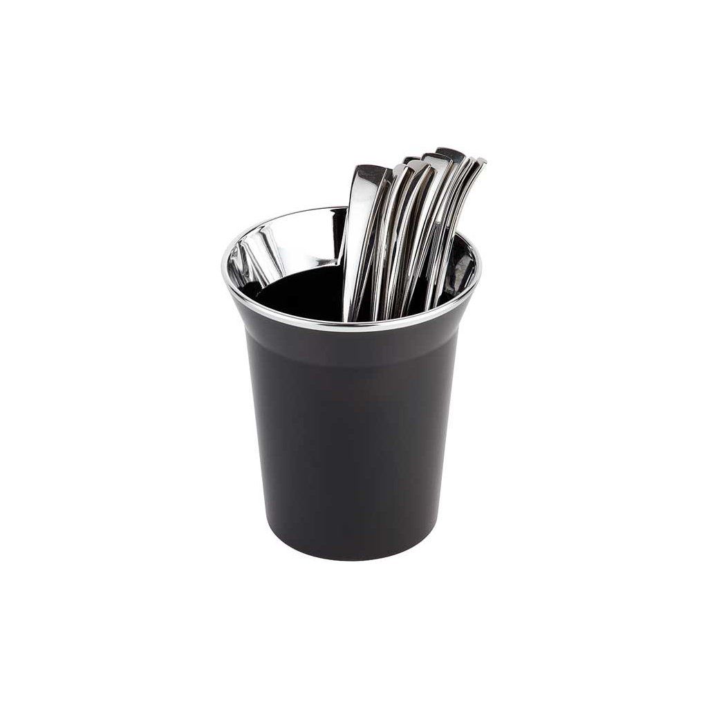 Nádoba na příbory z černého plastu s chromovaným okrajem. Není vhodná do myčky. Může se stohovat.Doplňkové parametry