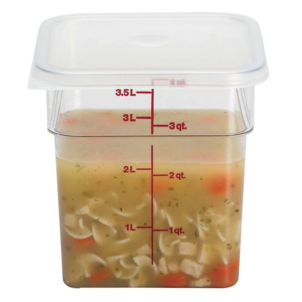 - Průhledný materiál: Průhledné víko umožňuje snadnou identifikaci obsahu nádob, což je užitečné zejména v profesionálních kuchyních, restauracích a cateringu.