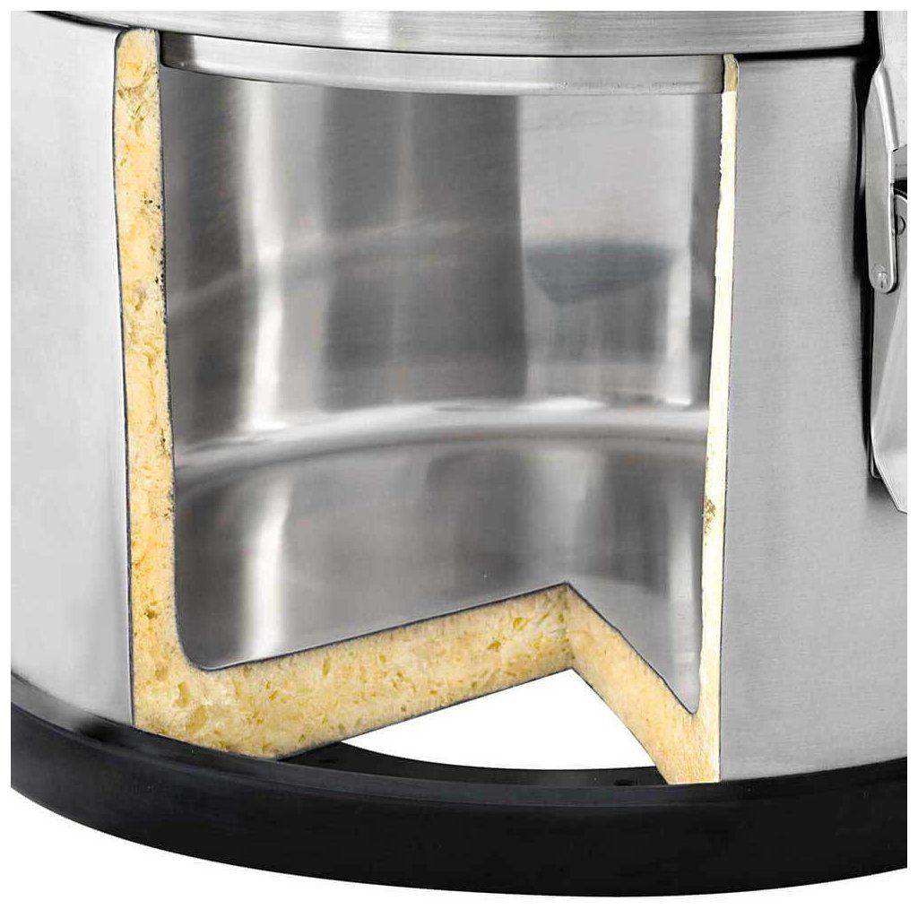 Ocelový termos s výpustným kohoutkem vyrobený z nerezové oceli s dvojitým pláštěm izolovaným speciální pěnou. Dvojité víko s izolační pěnou a s odolným silikonovým těsněním. Termos má ergonomická transportní ucha a šest háků držících víko. Dno termosu je opatřeno odolným gumovým návlekem, který umožňuje termosy stohovat a zabraňuje poškození podlahy. Termos má i vyrovnávací ventilek tlaku.Doplňkové parametry