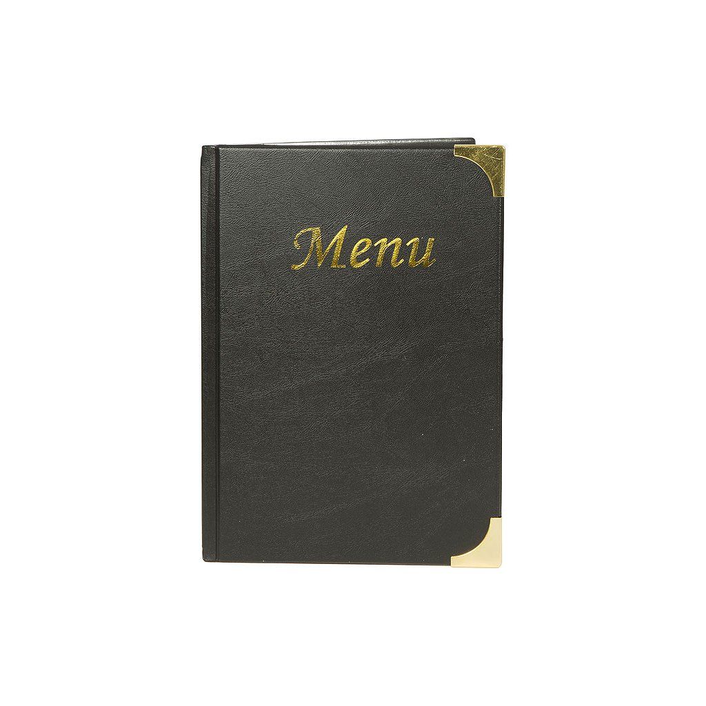 Obal na jídelní lístek se zlatým nápisem "Menu" ve formátu A5. Lehce se čistí. Vyrobený z odolného materiálu podobného kůži. Maximálně na 10 papírů A5 (2 místa na obalu a 4 oboustranné vložky).Doplňkové parametry