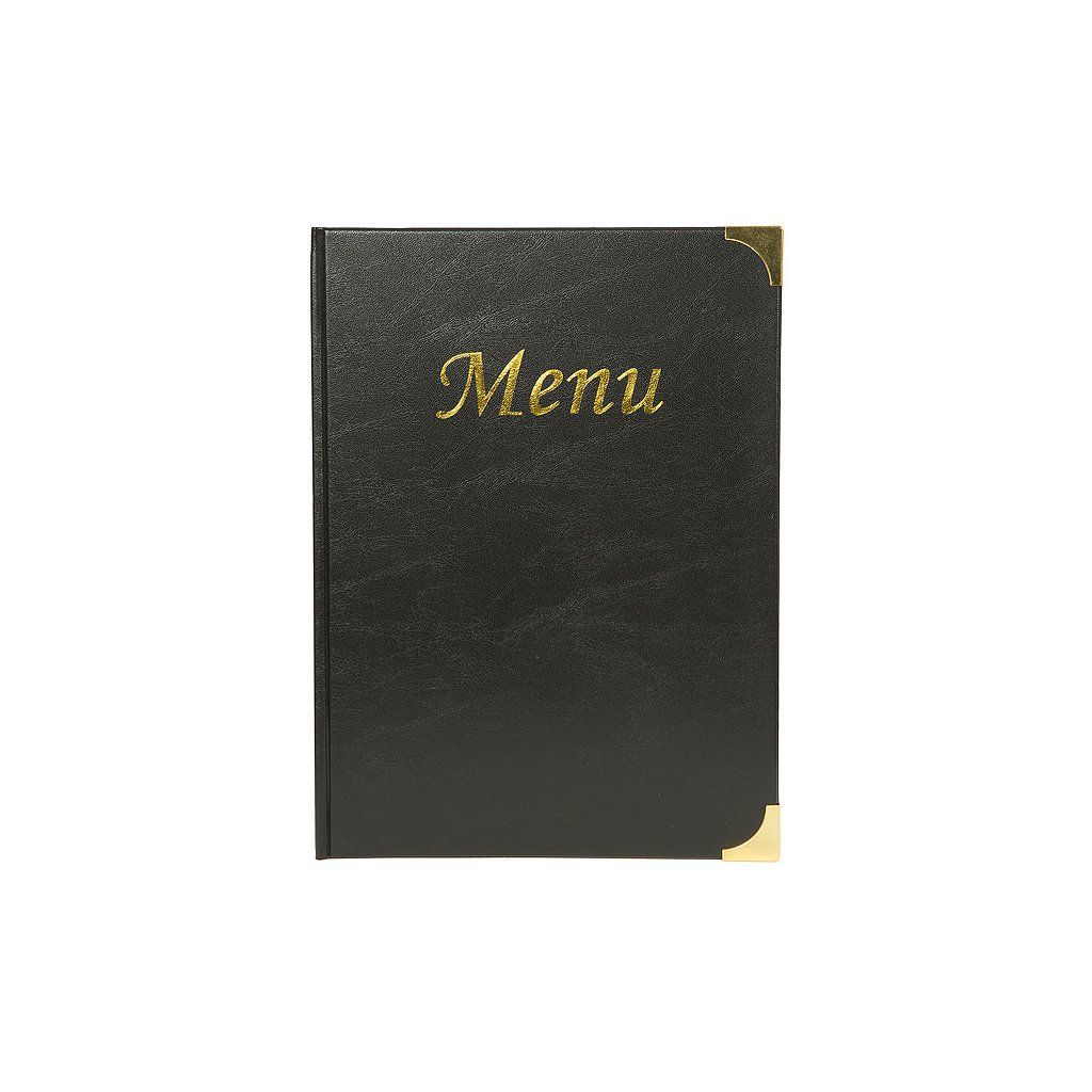 Obal na jídelní lístek se zlatým nápisem "Menu" ve formátu A4. Lehce se čistí. Vyrobený z odolného materiálu podobného kůži. Maximálně na 10 papírů A4 (2 místa na obalu a 4 oboustranné vložky).Doplňkové parametry