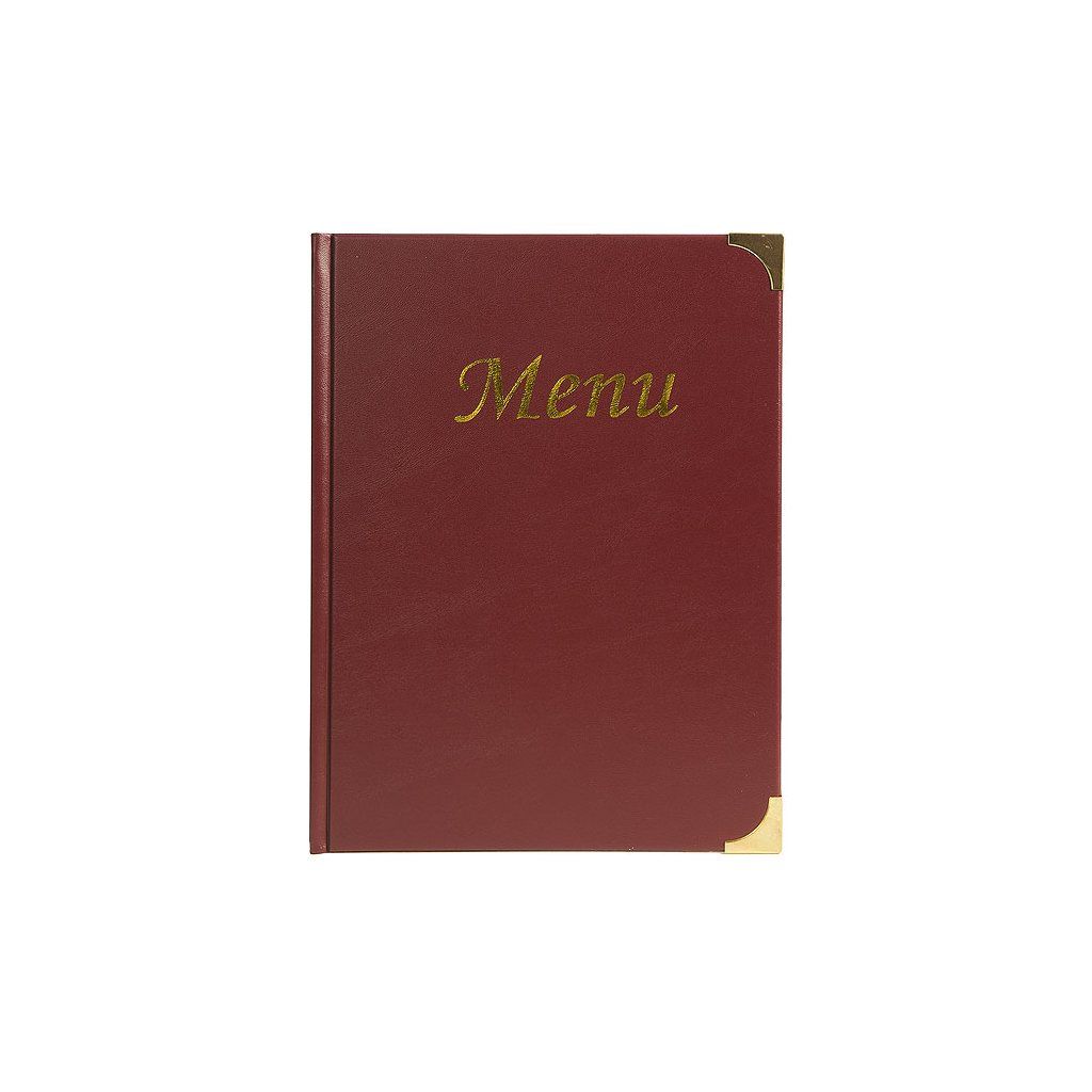Obal na jídelní lístek se zlatým nápisem "Menu" ve formátu A4. Lehce se čistí. Vyrobený z odolného materiálu podobného kůži. Maximálně na 10 papírů A4 (2 místa na obalu a 4 oboustranné vložky).Doplňkové parametry