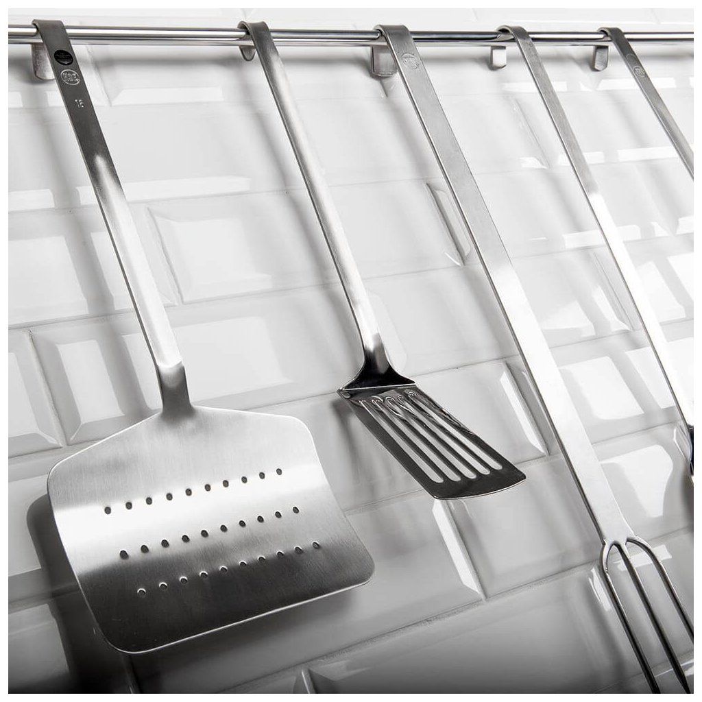 Obrácečka vyrobená z nerezové oceli. Zahnutý konec rukojeti umožňuje zavěšení příboru na věšáku nebo na okraji okapu.Doplňkové parametry