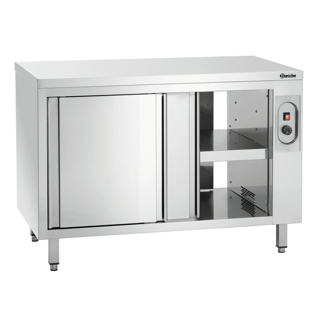 Ohřevná skříň o šířce 1,2 m nabízí plynule nastavitelný vyhřívaný úložný prostor s obsluhou z obou stran. Odolná plocha z nerezové oceli zároveň slouží jako pevná pracovní deska a dobře zapadne do profesionální kuchyňské sestavy.