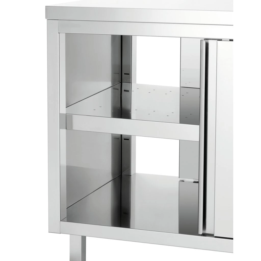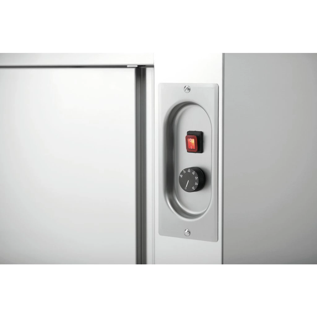 Ohřevná skříň o šířce 1,6 m nabízí plynule nastavitelný vyhřívaný úložný prostor s možností obsluhy z obou stran. Robustní nerezová konstrukce zároveň slouží jako pevná pracovní plocha, která se snadno začlení do profesionální kuchyně.