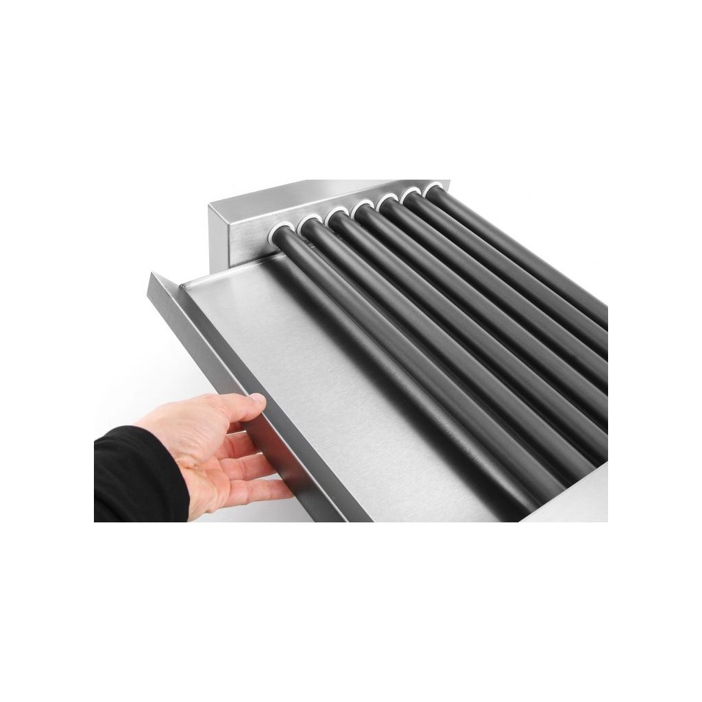 Plášť je vyroben z nerezové oceli. Rychlé nahřátí a rekuperace tepla. Rolky jsou potažené nepřilnavým povrchem. Odnímatelná, snadno se čistící odkapávací miska pro mastnoty a zbytky. Délka rolky: 42 cm. Max. teplota rolky závisí na takových faktorech, jako je teplota okolí, množství párků a proudění vzduchu. Rolky bez uložených párků při pokojové teplotě mohou dosáhnout teploty 150 stupňů Celsia. 2 varné zóny, 11 rolek.Doplňkové parametry