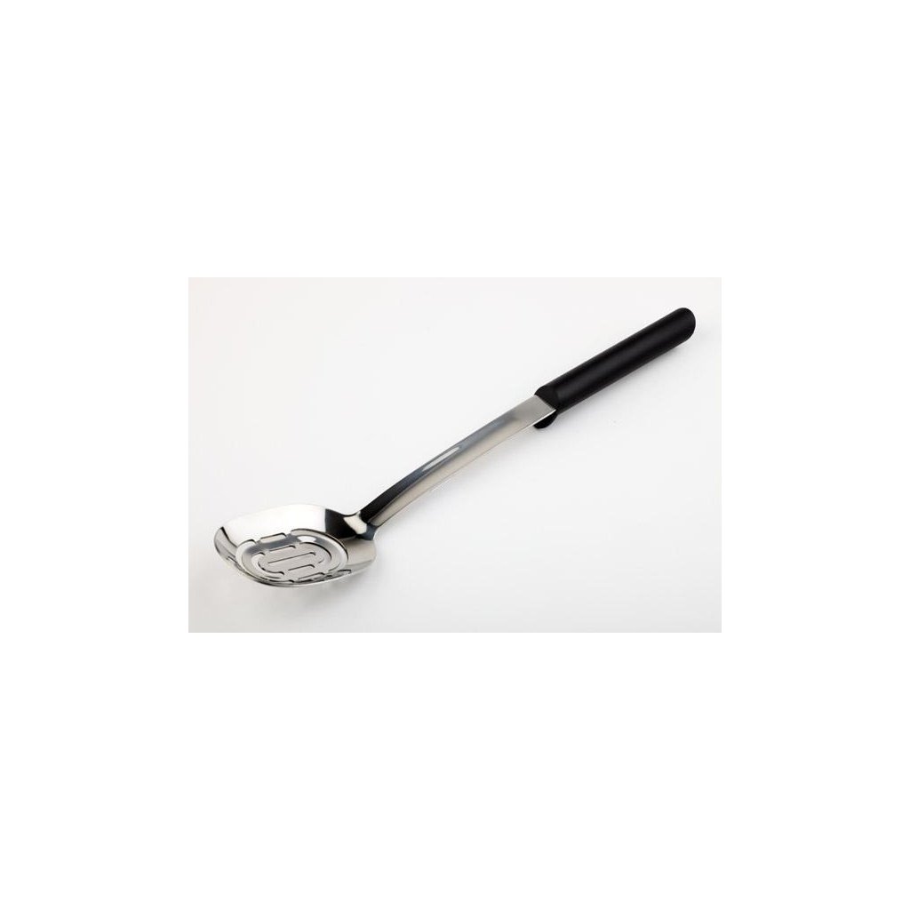 Perforovaná lžíce z nerezové oceli 18/8, tloušťka 2,5 mm. Černý, ergonomický úchyt s funkcí STOP zabraňuje pádu lžíce do nádoby s pokrmem. Teplotní odolnost do 120° Celsia. Vhodné do myčky. Pracovní plocha 100x75 mm.Doplňkové parametry
