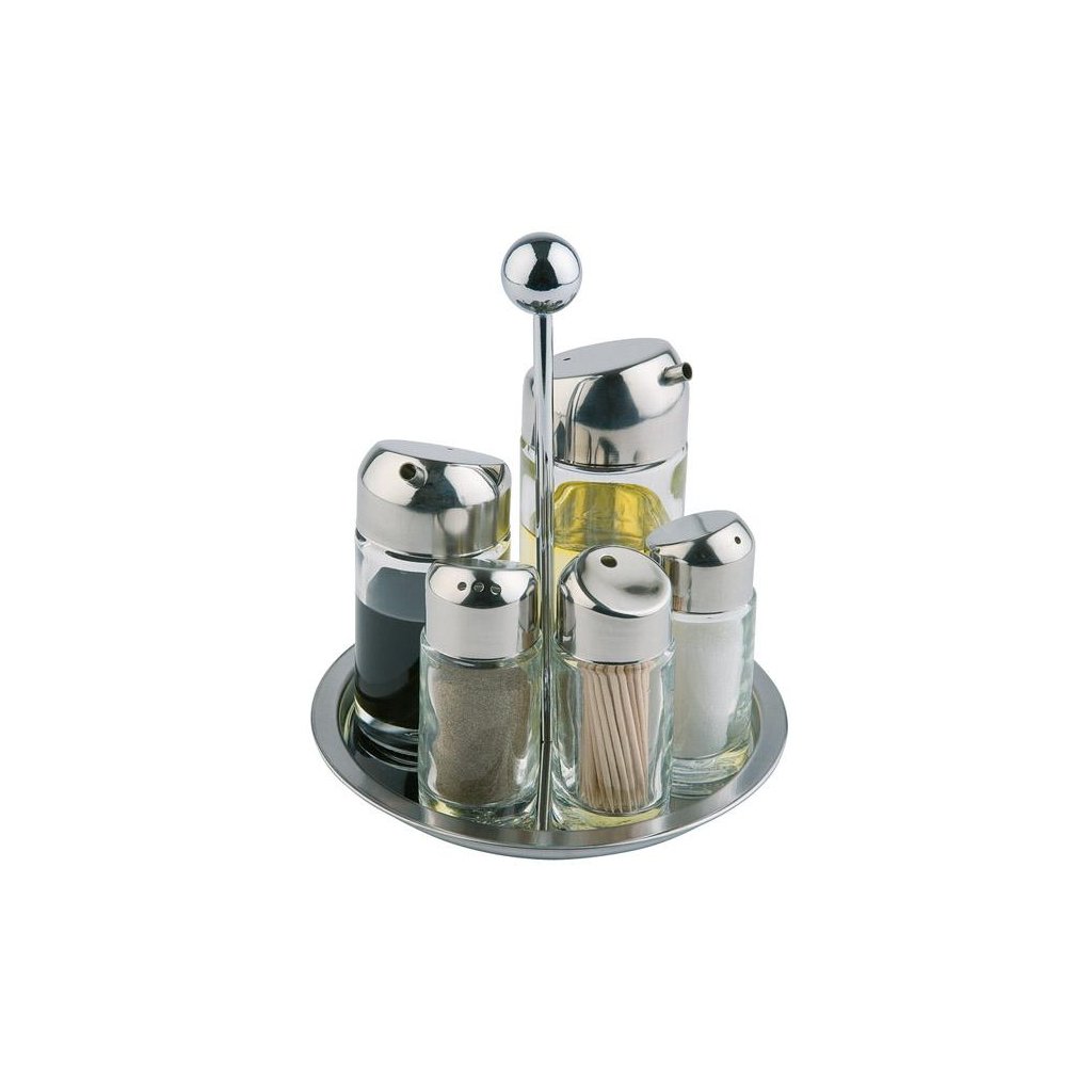 Sada kořenek z nerezové oceli. Skleněné nádoby na sůl, pepř, olej, ocet a párátka s víčky z nerezové oceli. Otočná základna. Lze mýt v myčce nádobí.Buďte první, kdo napíše příspěvek k této položce.