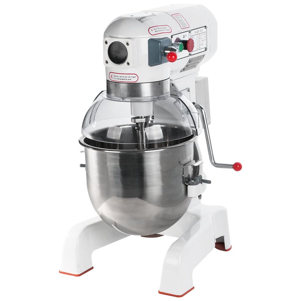 Planetární mixér na lehké těsta a šlehání pěny. Moderní konstrukce – korpus je vyroben z hliníku a části, které přicházení do kontaktu s potravinami, z nerezové oceli. V sadě odnímatelná díže o objemu 20 l a průměru 320 mm zavěšená na pohyblivých ramenech, vybavená bezpečnostní clonou. V sadě sada tří koncovek. Tři pracovní rychlosti 113/168/400 ot./min. Pozor: Před změnou rychlosti je třeba zařízení zastavit.Doplňkové parametry