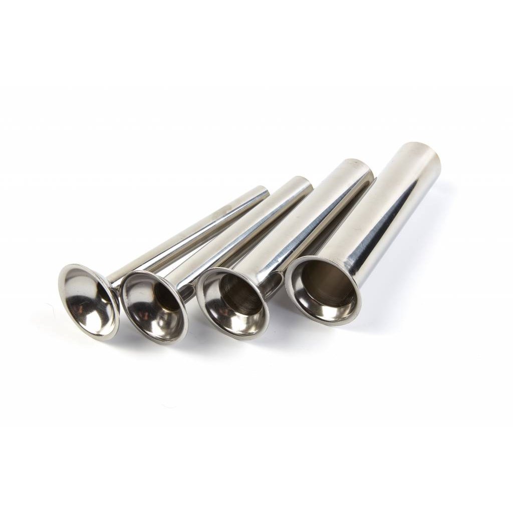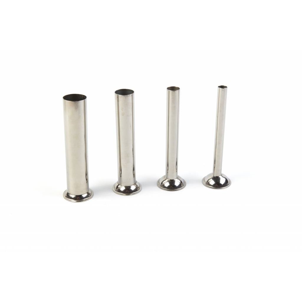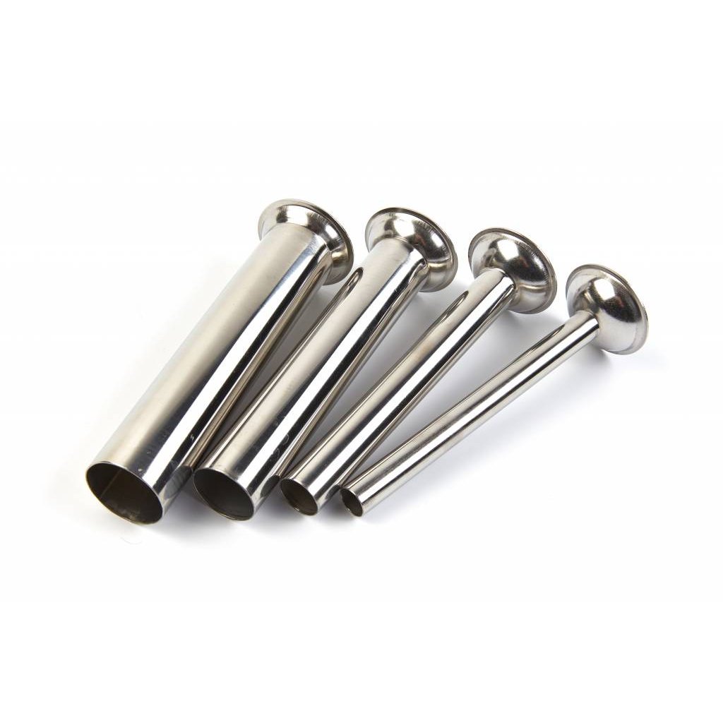 Tato sada čtyř plnicích trubek z nerezové oceli je vhodná pro plničky klobás a churros Maxima. Sada obsahuje trubičky o průměru 16 mm, 22 mm, 32 mm a 38 mm. Snadno tak vyberete správnou velikost - od tenkých klobás až po velké churros. Trubičky jsou pevné, odolné a snadno se čistí. Univerzální příslušenství pro řeznictví, pekárny a profesionální kuchyně.