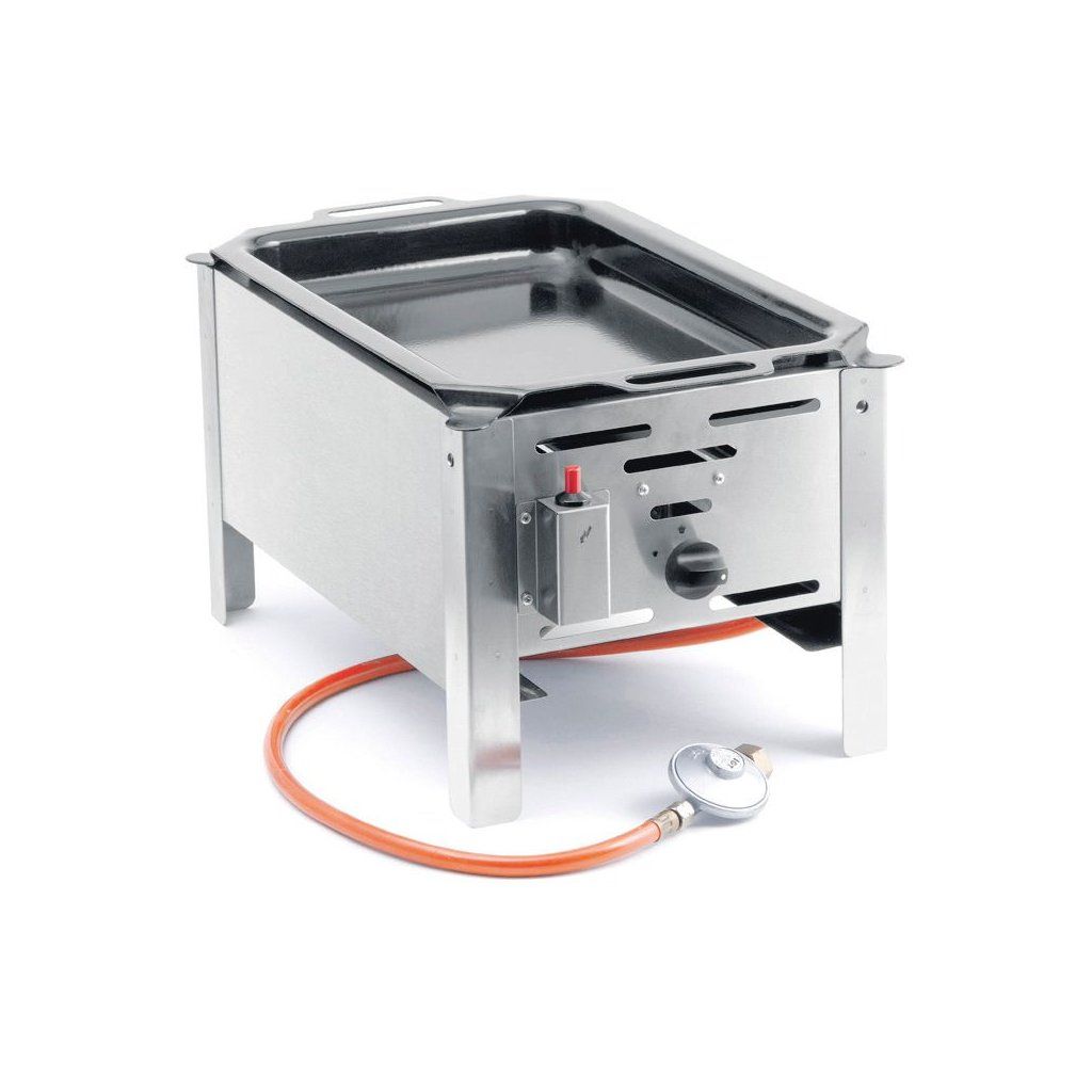 Vyrobená z nerezové oceli. Elektronické zapalování, ventil, termočlánek a plynové potrubí s redukcí. Zahrnuje: smaltovaný plech(290x480 mm) s rukojetí. Na plynovou láhev. Spotřeba plynu: 0,215 m³/hDoplňkové parametry
