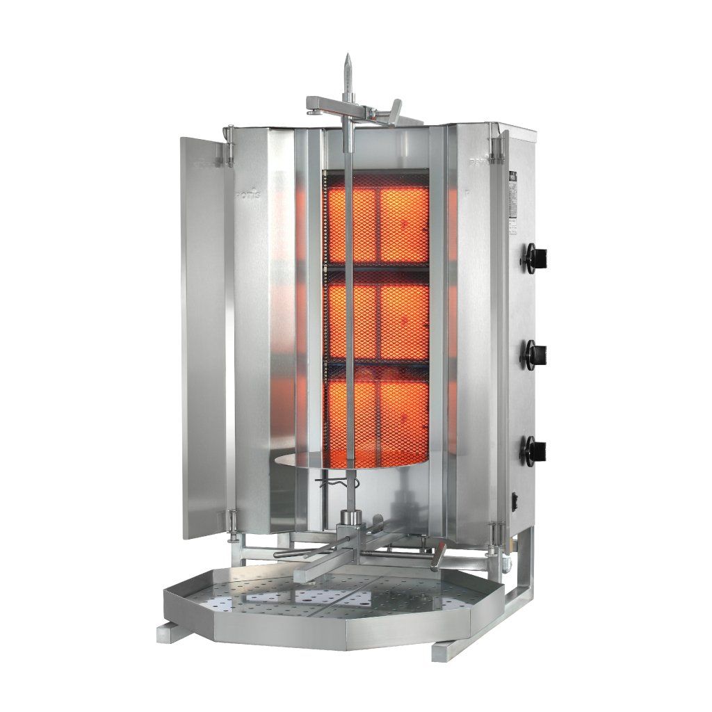 Plynový gril na kebab/gyros, 3 topná pole, zátěž 40 kg, 10,5 kW, dolní pohon, 550x510x830 mm, nádoba na tuk 500x500 mm | POTIS, MU GD3/LPG