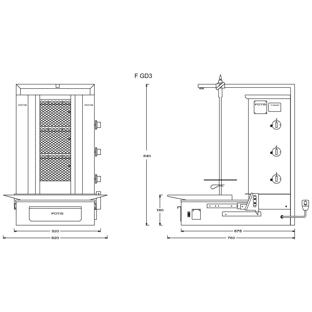 Plynový gril na kebab/gyros, 3 topná pole, zátěž 40 kg, 10,5 kW, dolní pohon 3,5 W, 760x620x840 mm | POTIS, F GD3/LPG