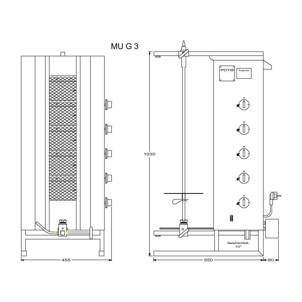 Plynový gril na kebab/gyros, 3 topná pole, zátěž 50 kg, 8,75 kW, dolní pohon, 550x455x103 mm, nádoba na tuk 550x550 mm | POTIS, MU G3/zemní plyn