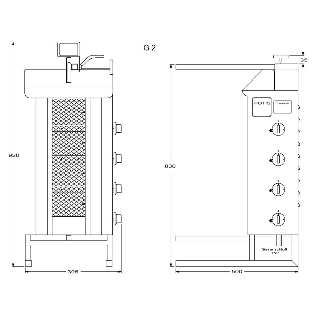 Plynový gril na kebab/gyros, 4 topná pole, zátěž 30 kg, 7 kW, 500x395x920 mm, nádoba na tuk 500x500 mm | POTIS, G2/LPG