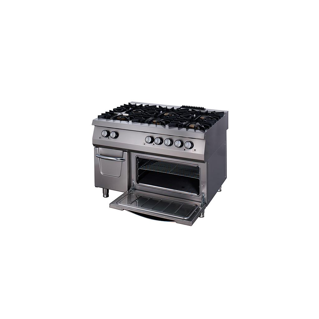 Pod sporákem se šesti hořáky se nachází prostorná trouba s třífázovým napájením (400 V). Statická komora trouby je vyrobena z nerezové oceli, přičemž dvířka jsou mimořádně těžká a mají tloušťku 40 mm. Uvnitř se nachází chromovaný rošt se třemi úrovněmi, na který můžete umístit nádoby o objemu 2/1 GN. Teplotu můžete nastavit v rozmezí 100 až 300 °C. Kromě trouby máte k dispozici také praktickou skříňovou základnu, která má dvířka s magnetickým zavíráním. Zde máte dostatek prostoru pro přehledné uložení například kuchyňského náčiní a pánví.
