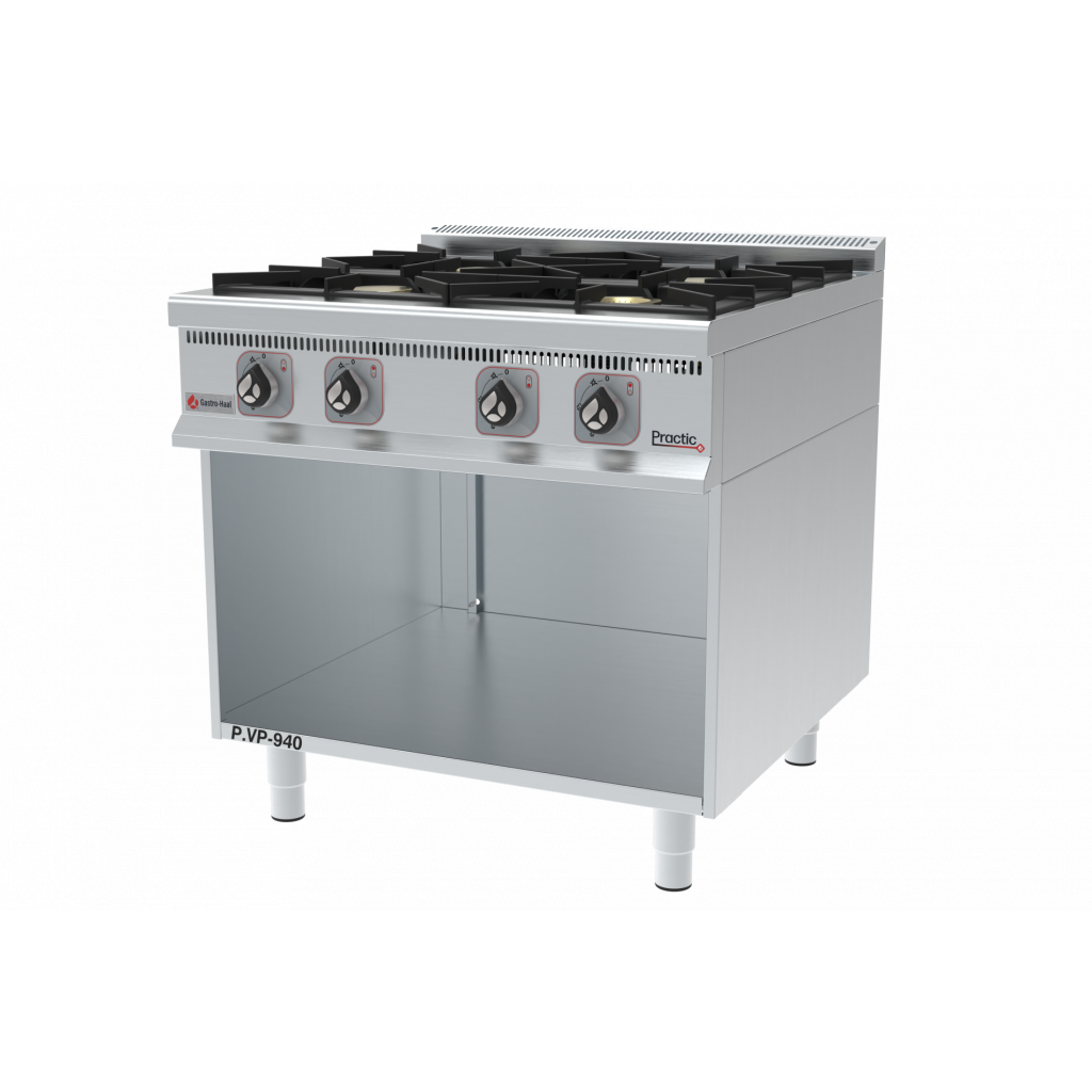 Plynový sporák se základnou P.VP-940 je profesionální zařízení s vysokým výkonem, které je ideální pro každodenní provoz ve velkokapacitních kuchyních. Horní část je vybavena čtyřmi výkonnými plynovými hořáky, spodní část může sloužit jako praktický úložný prostor s dvířky a policemi dle požadavků zákazníka.