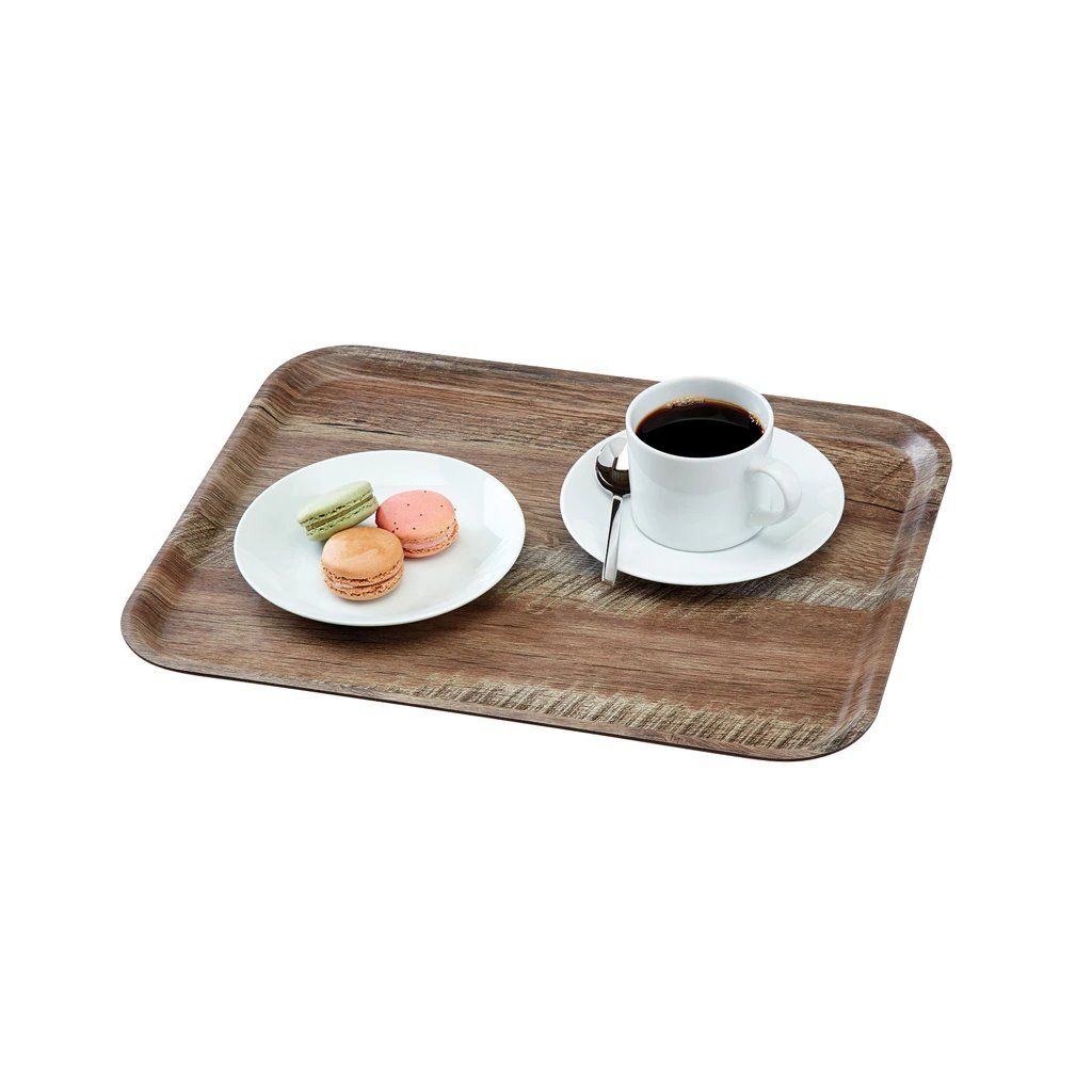 Jídelní podnos s texturovanou povrchovou úpravou napodobuje pocit dřeva. Je ideální pro servírování vašich pokrmů u jídelního stolu, v bufetu nebo pro pokojovou službu. Hodí se tak do různých podniků od restaurací, hotelů až po školky a školy. Podnos má teplotní odolnost domaximálně 100 °C, a tudíž se do takové teploty může mýt v myčce na nádobí. Je také perfektně stohovatelný, což šetří vaše prostory a skladování.Podnos 36 × 46 cm, tmavý dub