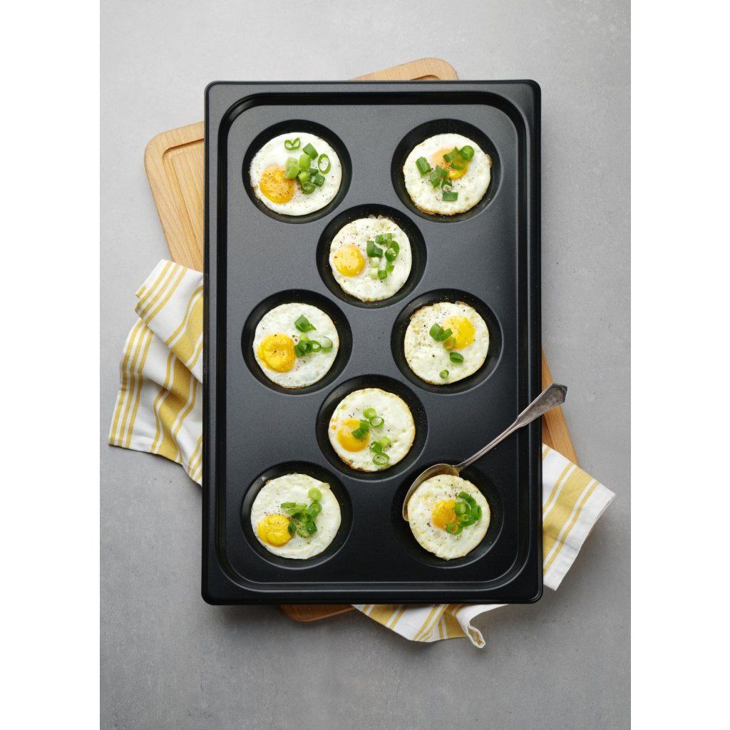 Vyrobeno z nerezové oceli. Povrch je opatřen nepřilnavou vrstvou PTFE. Velikost: GN 1/1. Teplotní odolnost: do 260 °C. 8 forem ideálních na smažená vejce, palačinky, omelety. Formy měří nahoře ø11 cm, dole ø8 cm a jsou hluboké 2 cm. Nelze mýt v myčce na nádobí.Buďte první, kdo napíše příspěvek k této položce.