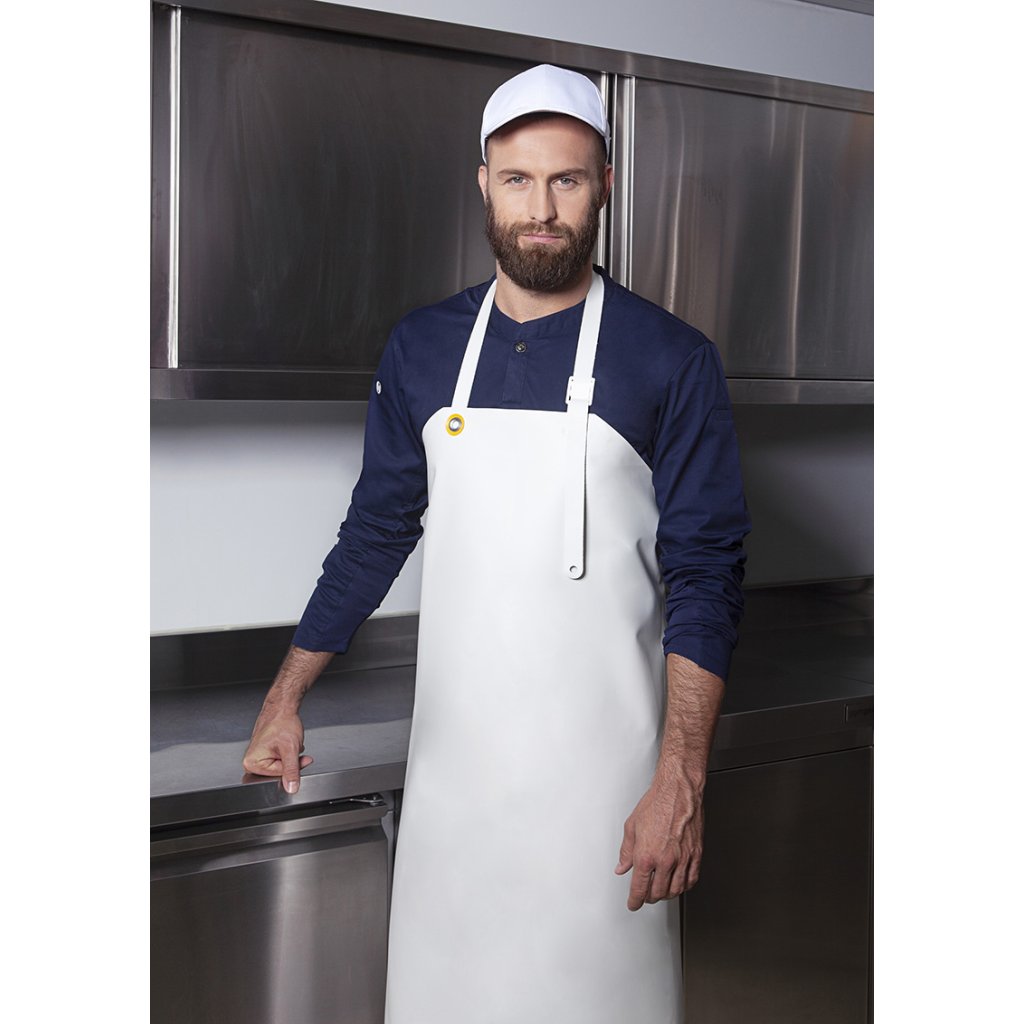| rozměry: 100 x 118 cm (šířka x délka) | tloušťka: 500 mikrometrů (± 50) | tloušťka: 500 mikrometrů (± 50) | materiál: nitrilová tkanina s oboustrannou povrchovou úpravou na polyesterové bázi, gramáž 600 g/m² | voděodolná | | potahovaná zástěra s krčním a pasovým pásem pro použití v zemědělství a potravinářství | OOP (osobní ochranné prostředky): Kategorie I | ideální ochrana proti postříkání při všech pracích v kuchyních, jatkách, chladírnách, mlékárnách, sýrárnách, rybích farmách atd. | vysoká odolnost proti živočišným tukům, krvi a kyselině mléčné | náprsník s nastavitelnou sponou z polypropylenu vhodného pro styk s potravinami pro variabilní nastavení délky | elastický polyesterový pásek s plastovými zapínáními v pase (flexibilní nastavení velikosti) | očka a kotouče z mosazi, bez niklu | snadné čištění kartáčem s mýdlovou vodou o teplotě 40 °C nebo směsí vody a jemného čisticího prostředku | odpovídající výrobek: Vodotěsná zástěra s laclem z PU - LS 31 (číslo výrobku výrobce)Doplňkové parametry