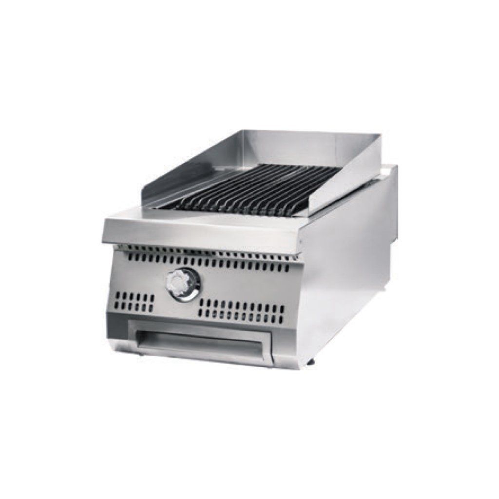 Gril Premium chargrill funguje na plyn a na rozdíl od běžných grilovacích desek ohřívá prostor pod grilovací deskou. Pod šikmým horním roštem se nachází litinový grilovací rošt, který rovnoměrně rozvádí teplo a zajišťuje shromažďování tuku v odkapávací misce pod grilovací plochou. Gril na dřevěné uhlí je vybaven vysokými ochrannými kryty z nerezové oceli, které zabraňují rozstřiku oleje. Spolu s ergonomickým designem grilu na dřevěné uhlí je tak zajištěna příjemná a bezpečná práce. Nerezový kryt a blatníky se snadno čistí. Díky hloubce 900 mm může gril na dřevěné uhlí grilovat velké množství potravin najednou.