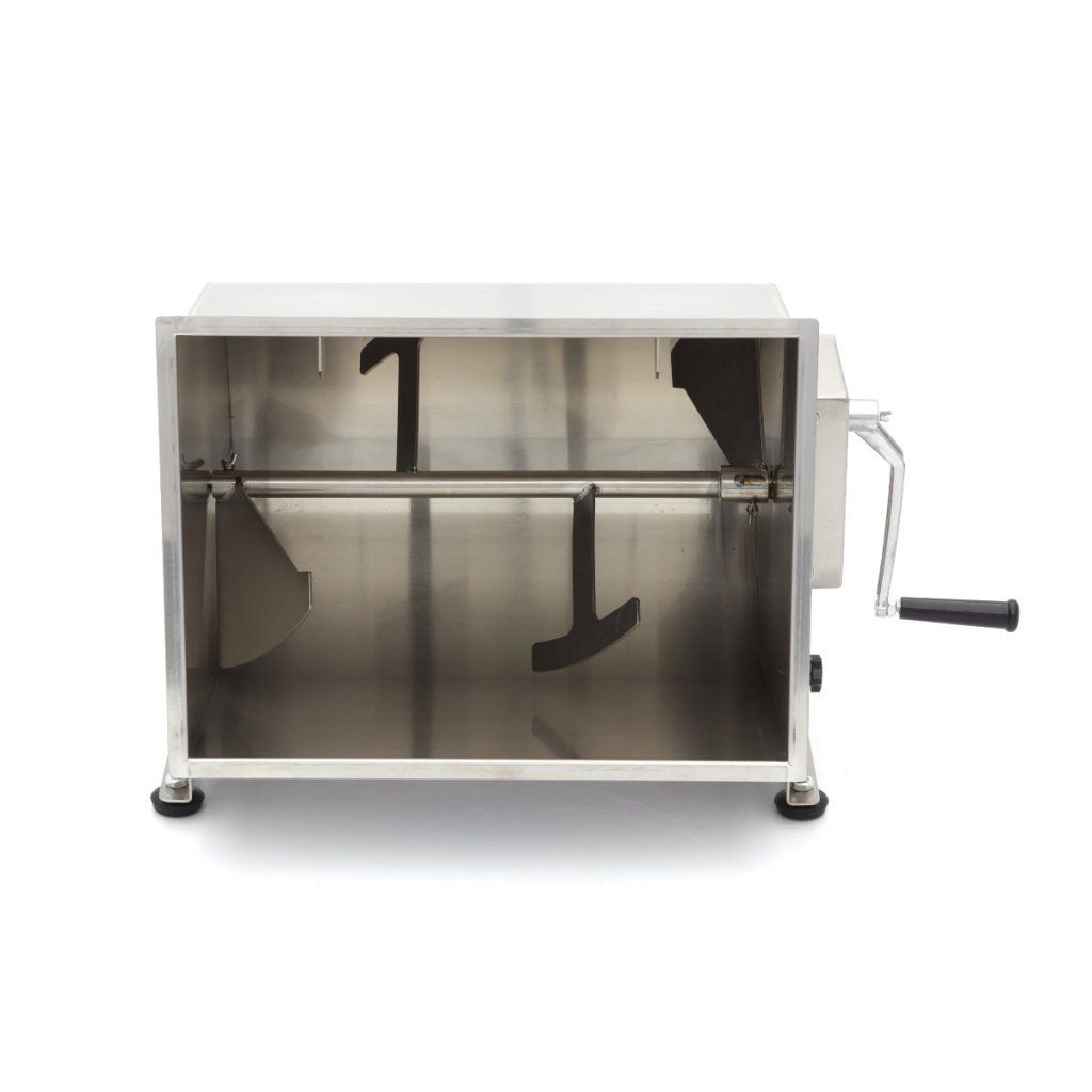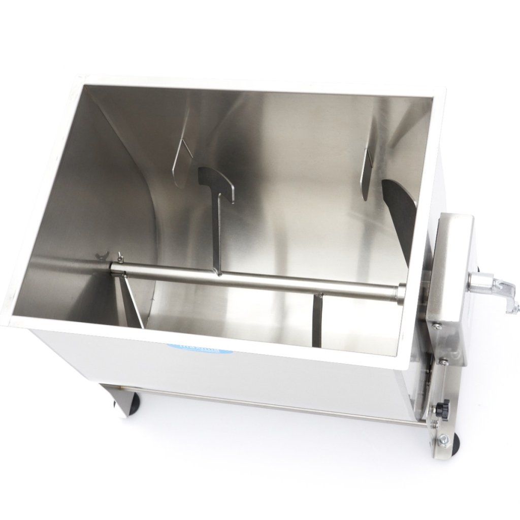 Mixování masa v tomto nerezovém mixéru je velmi snadné: stačí otevřít víko a naplnit nádrž požadovaným množstvím masa nebo ryby. Nádrž má objem 50 litrů a je vhodná pro zpracování 35-43 kg masa nebo ryb. Po přidání hlavní suroviny můžete přidat koření, jako jsou bylinky, ořechy nebo zelenina. Abyste vše dobře promíchali, otáčejte rukojetí, dokud nedosáhnete správné struktury masa nebo náplně. Mixér na maso se může otáčet ve dvou směrech. Výklopná nádrž je velmi praktická, když chcete obsah vyjmout, a nabízí také velkou výhodu při čištění. Pro dobrou přilnavost na téměř jakémkoli povrchu je mixér na maso vybaven čtyřmi gumovými nožičkami.
