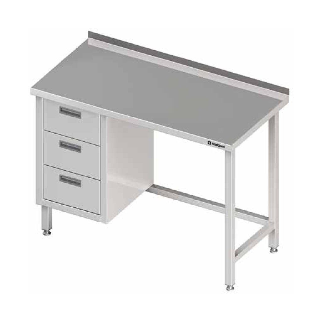 Přístěnný stůl s blokem tří zásuvek 1200x700x850 mm vyrobený z kvalitní nerezové oceli. Hloubka zásuvek 150 mm. Blok zásuvek z levé strany. Možnost montáže zámku za poplatek.Doplňkové parametry
