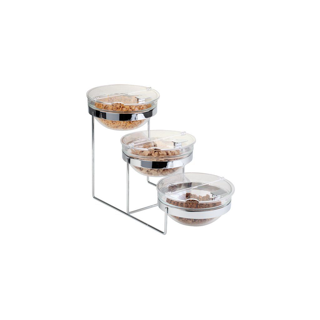 Univerzální třípatrový etažér. Součásti jsou: 3 skleněné mísy 2,5 l, 3 poklopy s výřezem na lžíci, chromovaný stojan.Doplňkové parametry