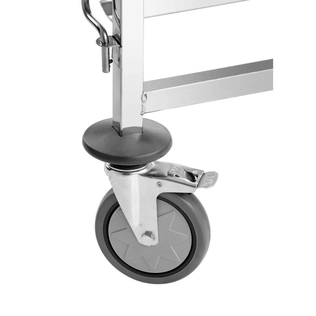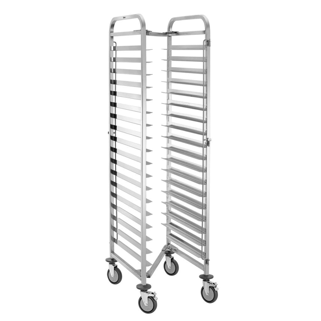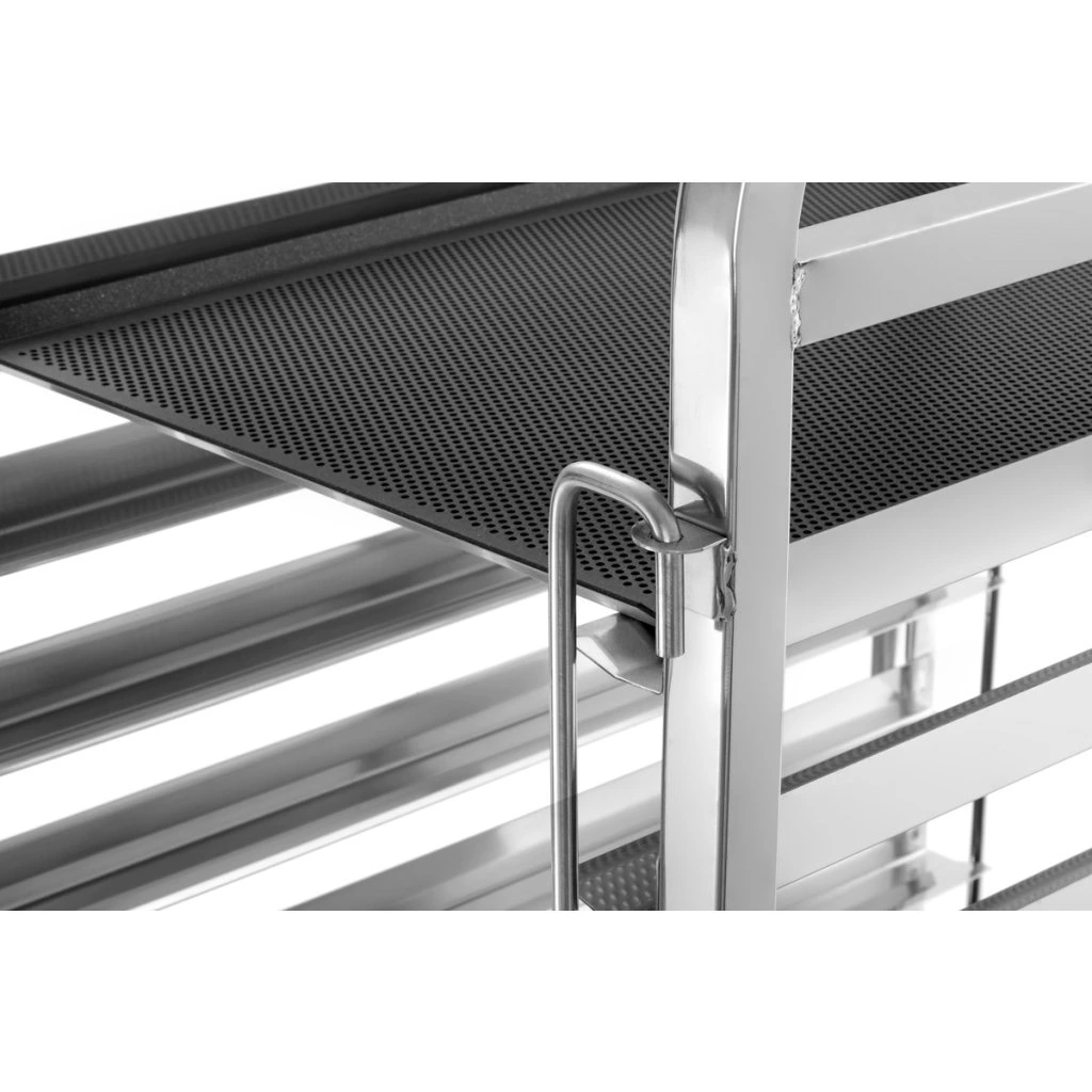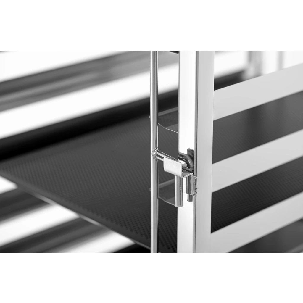 Ideální pro profesionální použití: vozík pojme až 18 standardních pekařských plechů o rozměrech 600 × 400 mm a podporuje přehlednou organizaci práce. Oboustranný systém zajištění nádob umožňuje rychlý a bezpečný transport i při vysoké frekvenci použití.