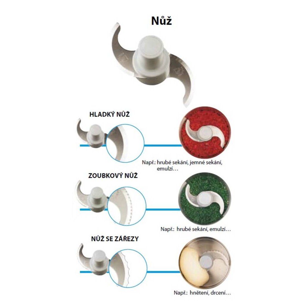 - lze v ní sekat maso, zeleninu, mandle, oříšky, koření, připravovatmajonézu, pyré, protlaky, pomazánky, strouhanku a hnětat těsto