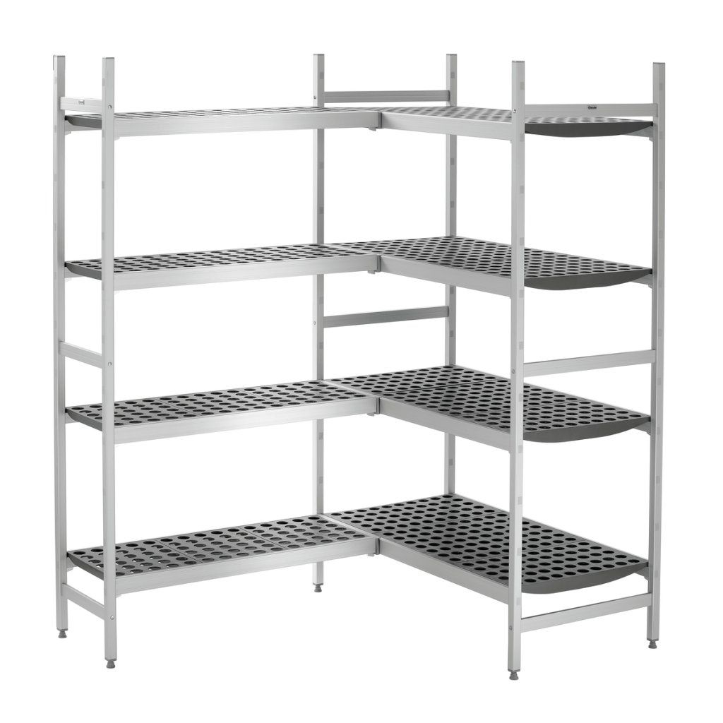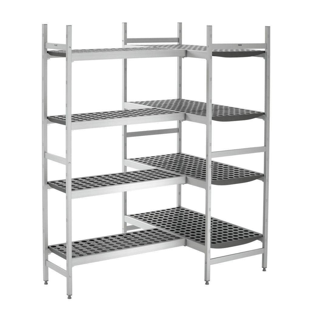 Pomocí spojovacích lišt lze regály o hloubce 360 mm propojit s dalšími prvky do rohové sestavy. Řešení v úhlu 90 stupňů umožňuje flexibilní, přehledné a prostorově úsporné rozšíření skladovacích ploch v gastronomii.