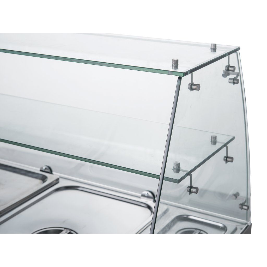 - Uvedená výška odpovídá úrovni, na které se nachází pracovní deska. Výška produktu spolu se skleněnou nástavbou činí 1310 mm. Ilustrační fotografie. GN nádoby a víčka k nim nejsou součástí balení.