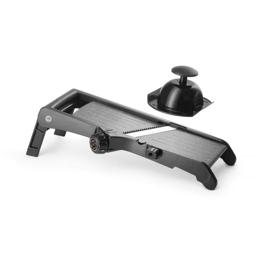 Robustní konstrukce z nerezové oceli, ABS a polypropylenu. Povrch je opatřen nepřilnavou vrstvou PTFE pro hladké krájení. Mimořádně ostré hlavní nože, snadné přepínání mezi hladkým a vlnitým nožem. Tloušťku plátků lze nastavit v rozmezí 0,5 až 9 mm. S integrovanými noži na 3mm julienne a 13mm hranolky. Možnost vyjmutí nožů julienne pro čištění, odblokování polohy vytištěné na voliči. Díky výsuvné nožce a háčku na mísu ji lze používat volně stojící, položenou na míse nebo i v ruce. Háček na mísu a nožičky vyložené protiskluzovým materiálem TPR (termoplastická guma) zajišťují stabilitu při používání. Dodává se s držákem na produkty, který chrání prsty při krájení, a se štíty na nože pro bezpečné skladování.Buďte první, kdo napíše příspěvek k této položce.