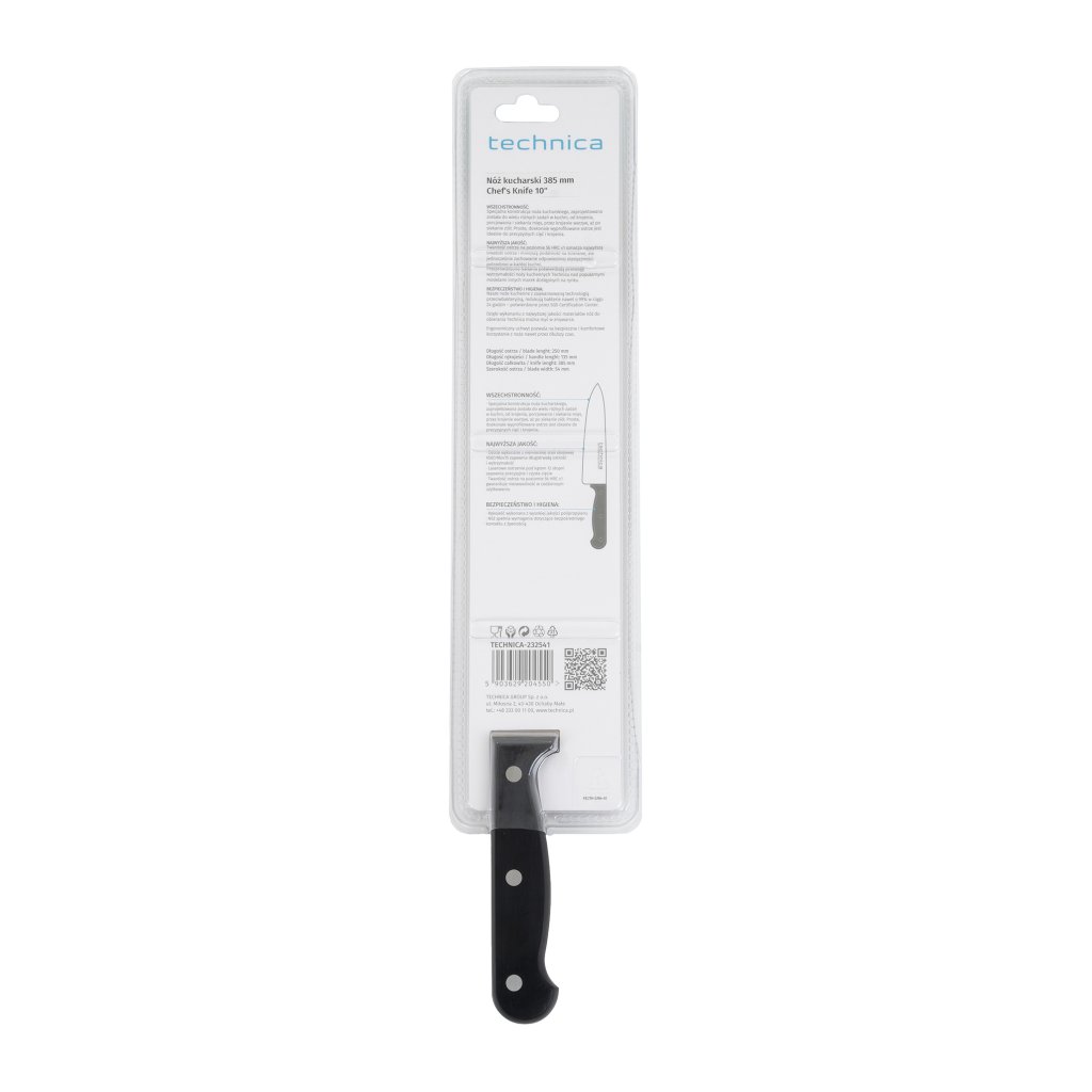Šéfkuchařský nůž Technica o délce 383 mm je profesionální nástroj, který spojuje funkčnost, přesnost a moderní technologii. Navržen pro intenzivní používání, disponuje čepelí z německé slitiny oceli X50CrMov15, která zajišťuje výjimečnou ostrost a odolnost. Černá rukojeť z polypropylenu poskytuje pohodlí, což činí tento nůž ideální volbou pro profesionály.